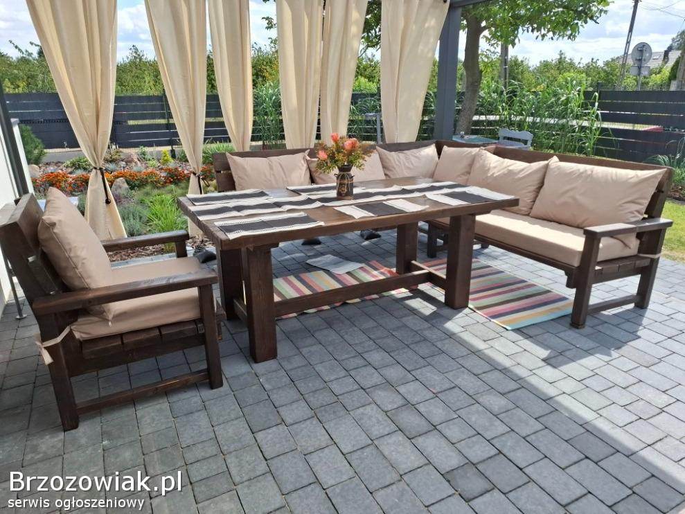 Meble ogrodowe drewniane i z metalu – stoły, ławki, huśtawki, komplety wypoczynkowe.