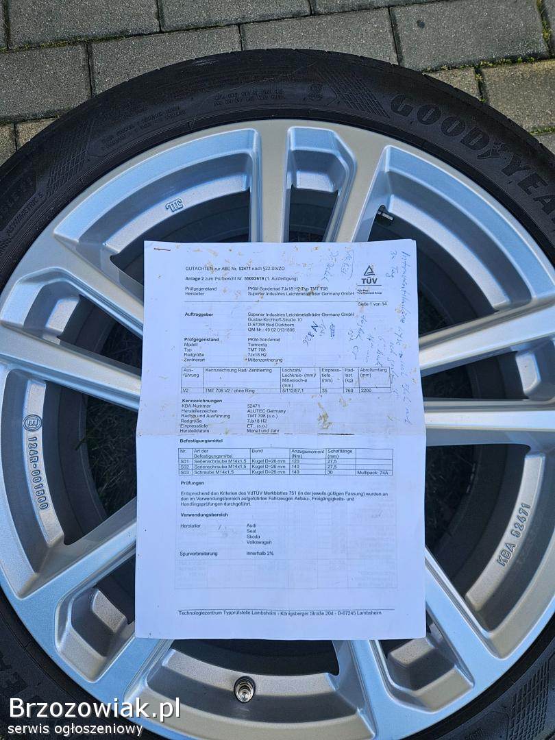 Sprzedam oryginalne alufelgi ALUTEC Made in Germany rozmiar r18 5x112 et 35 7j piasta 57. 1. Alufelgi w bardzo dobrym stanie, proste nie spawane. Opony letnie Goodyear 225/45 r18 Dot2519 bieznik 6 mm. Felgi posiadają również oryginalne dokumenty. Pasuja do wybranych modeli Audi Skoda Vw Seat Mercedes. W razie pytan prosze o kontakt 5. 3. 9. 7. 5. 1. 9. 8. 0
