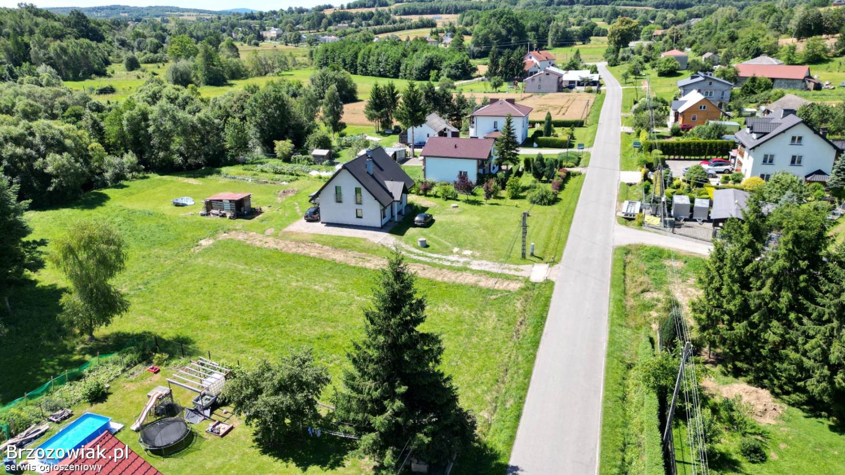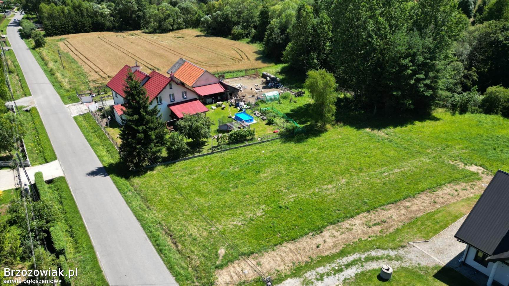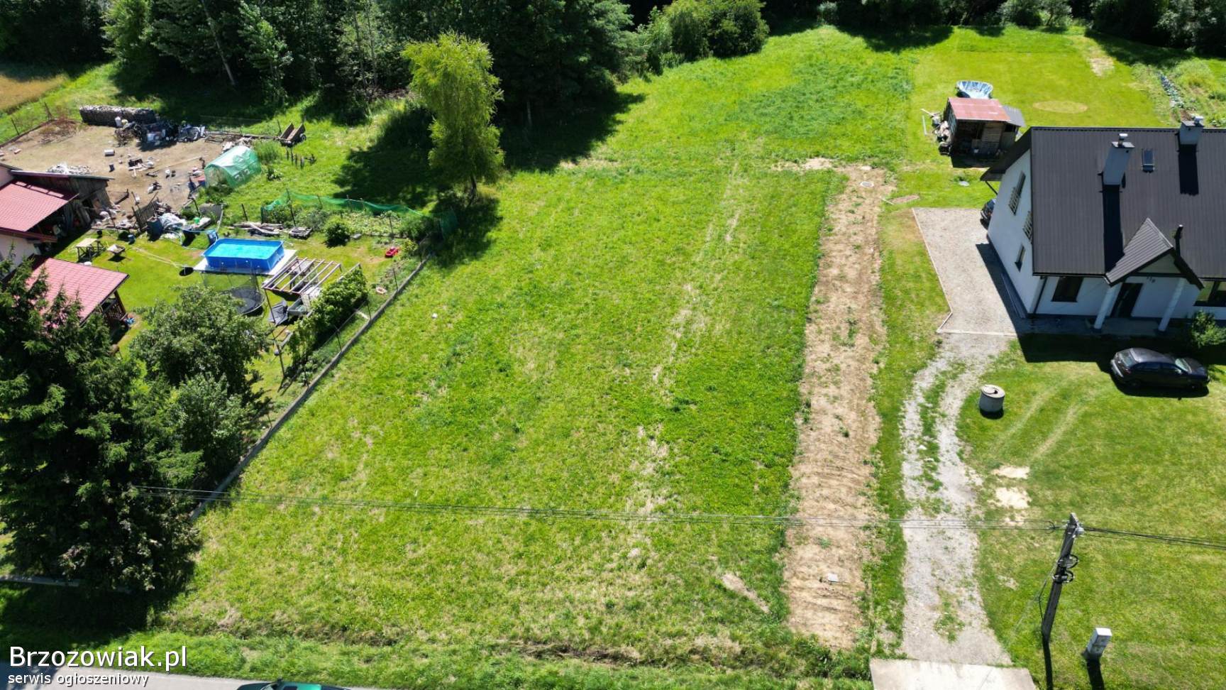 Działka posiada nieregularny kształt, częściowo zadrzewiona na końcu. W granicy działki płynie niewielki ciek wodny.