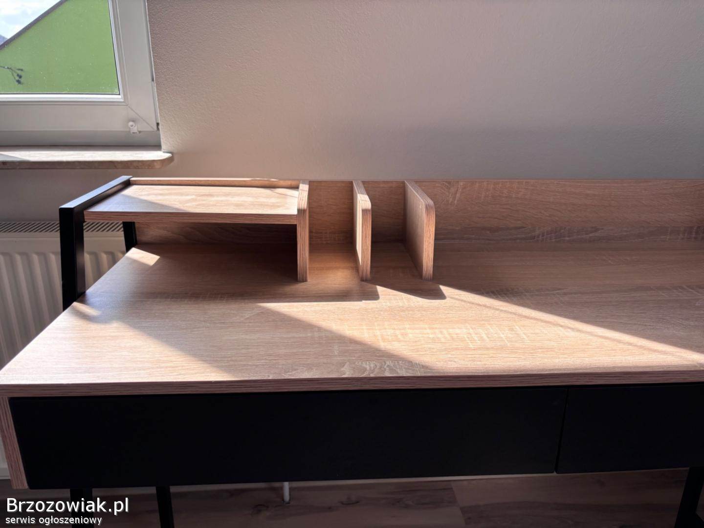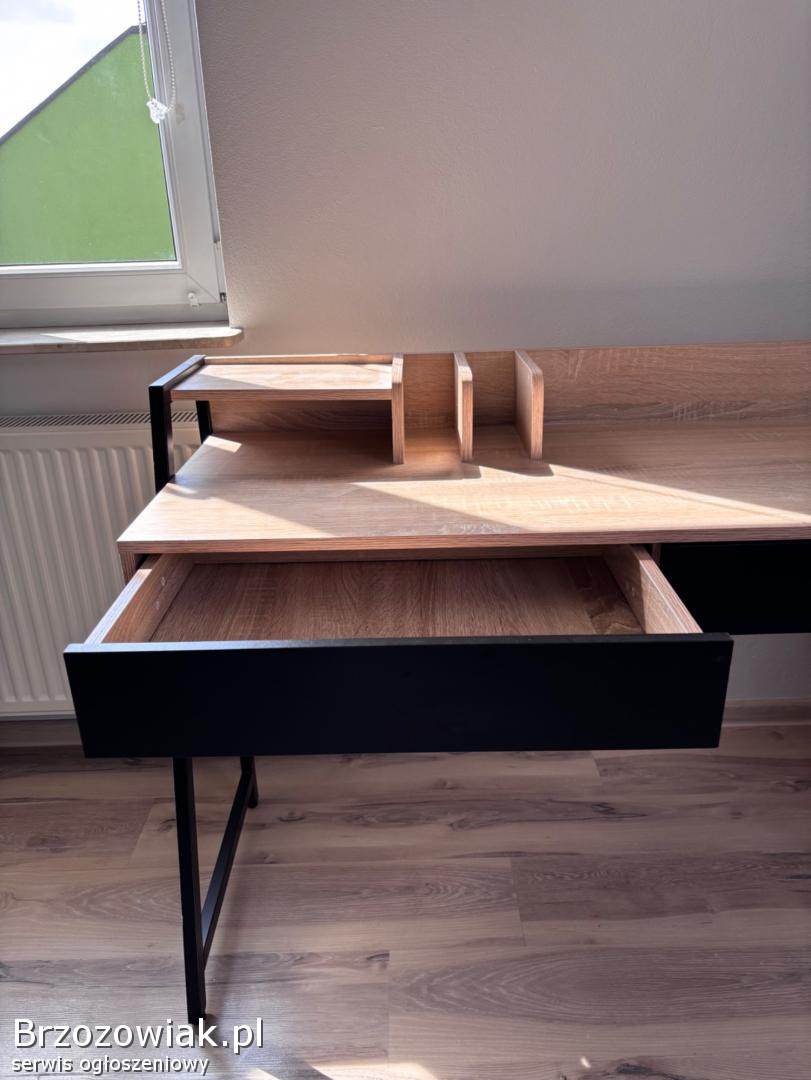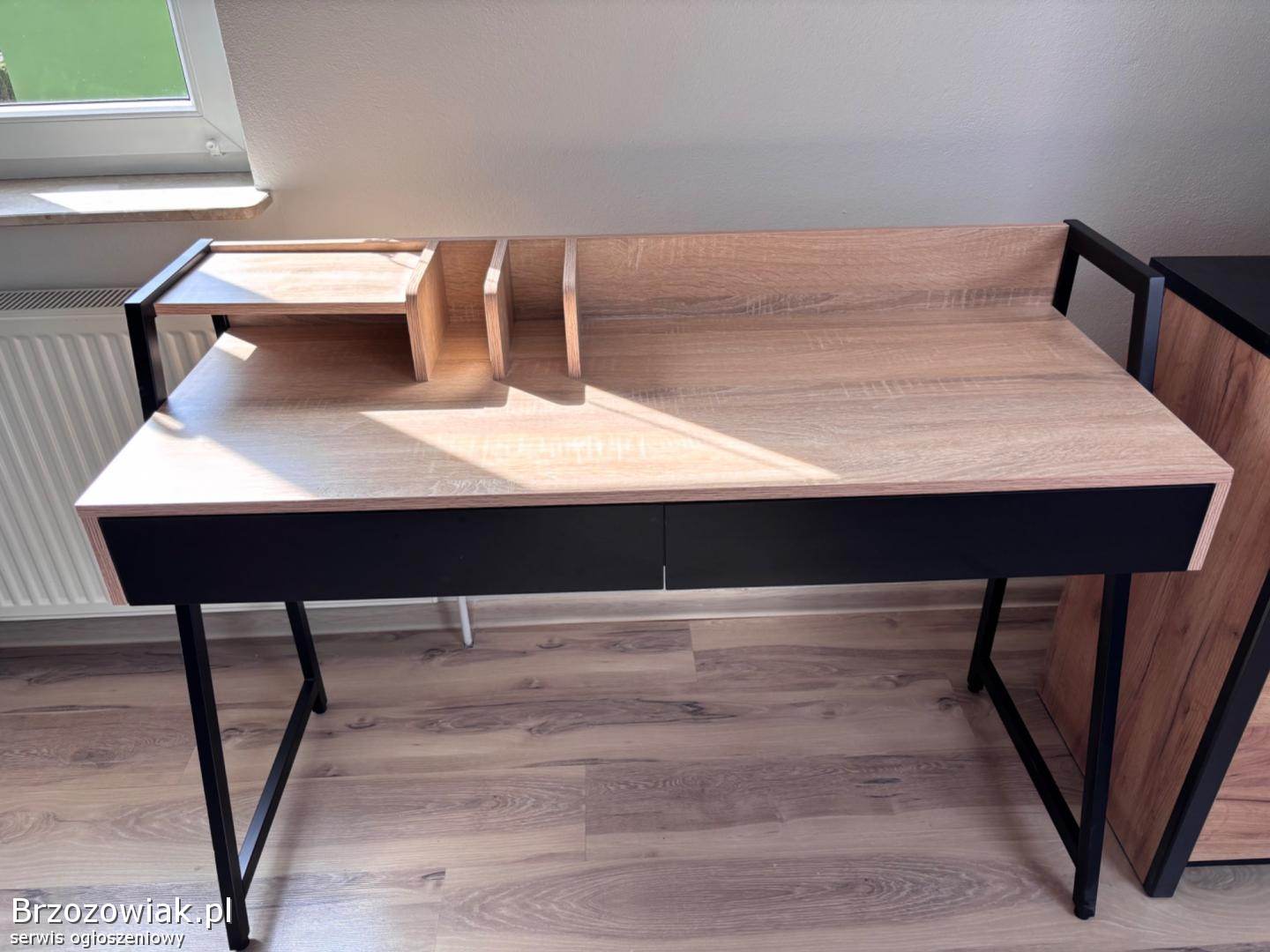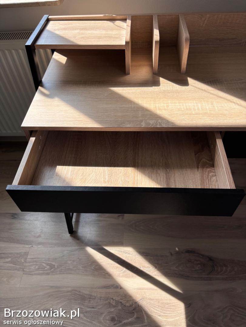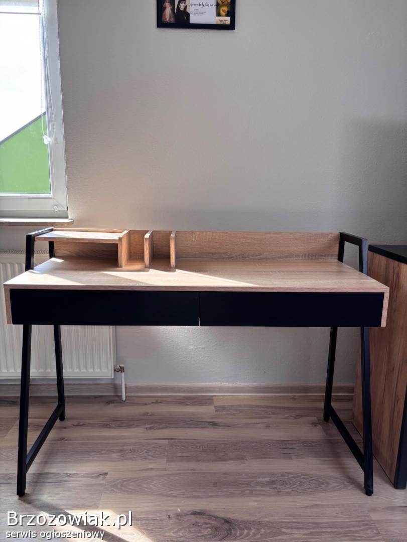 Nowoczesne biurko w stylu loftowym z drewnianym blatem i czarną konstrukcją. Posiada dwie pojemne szuflady oraz praktyczną nadstawkę na dokumenty i akcesoria. Stabilne i funkcjonalne, idealne do pracy lub nauki.