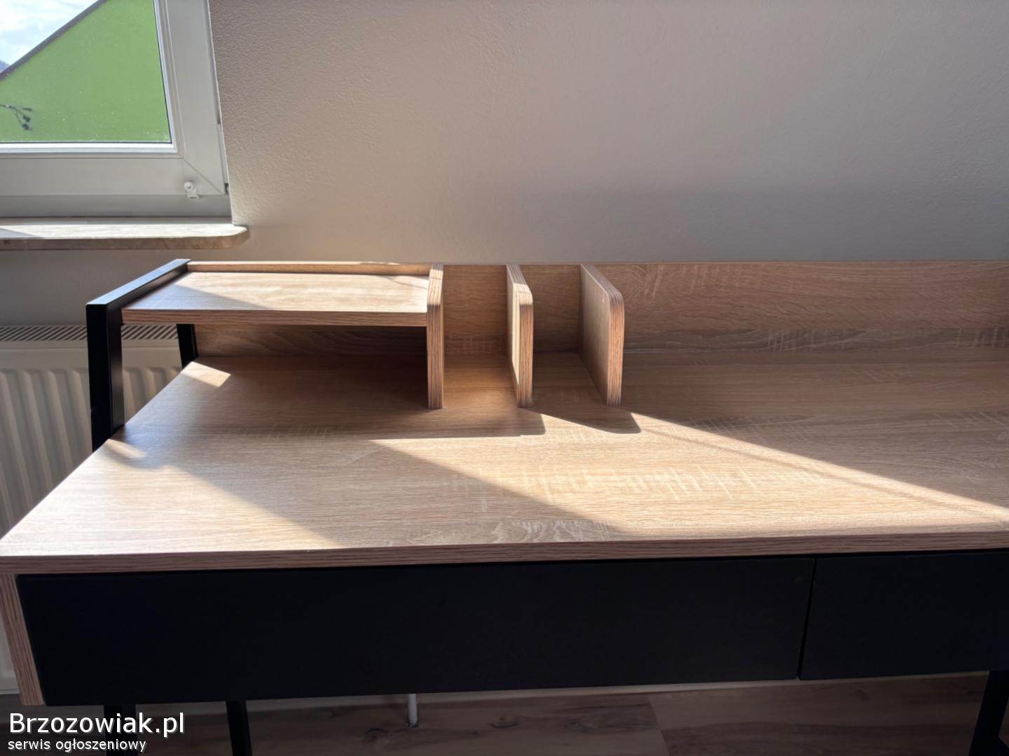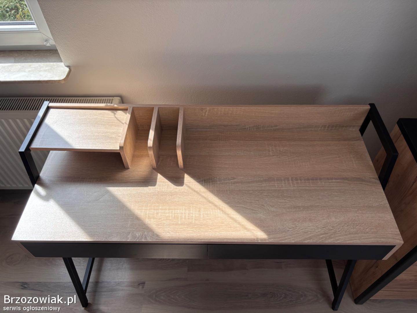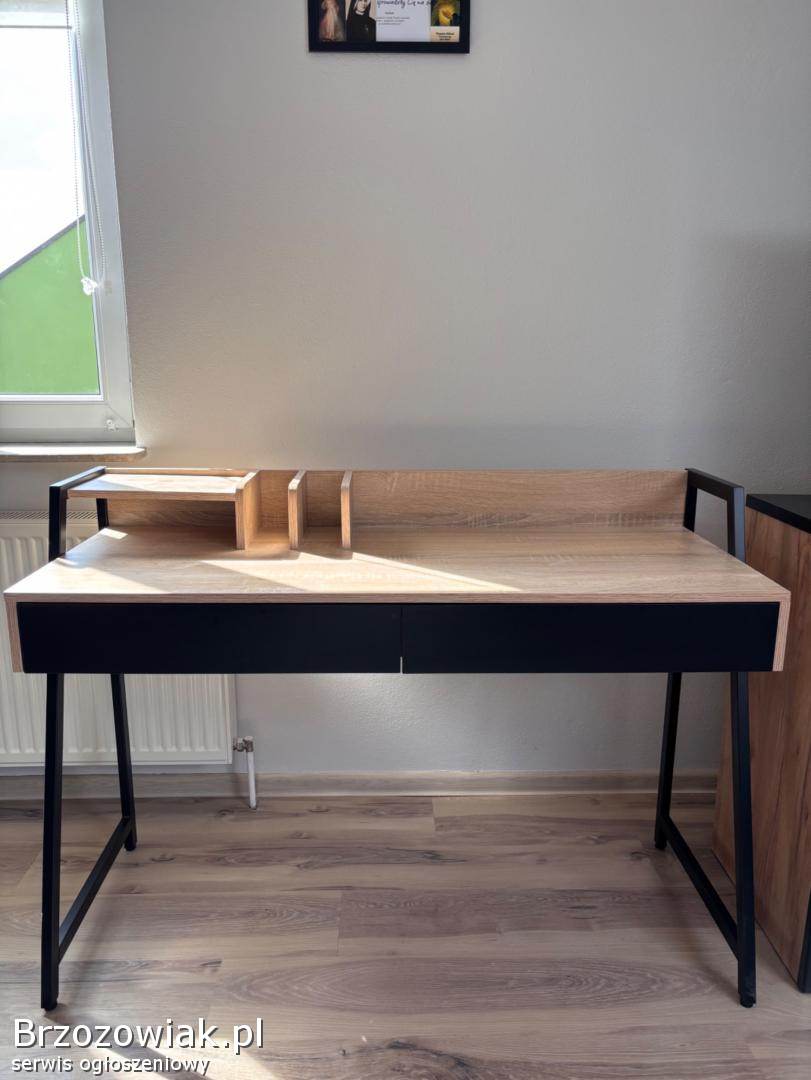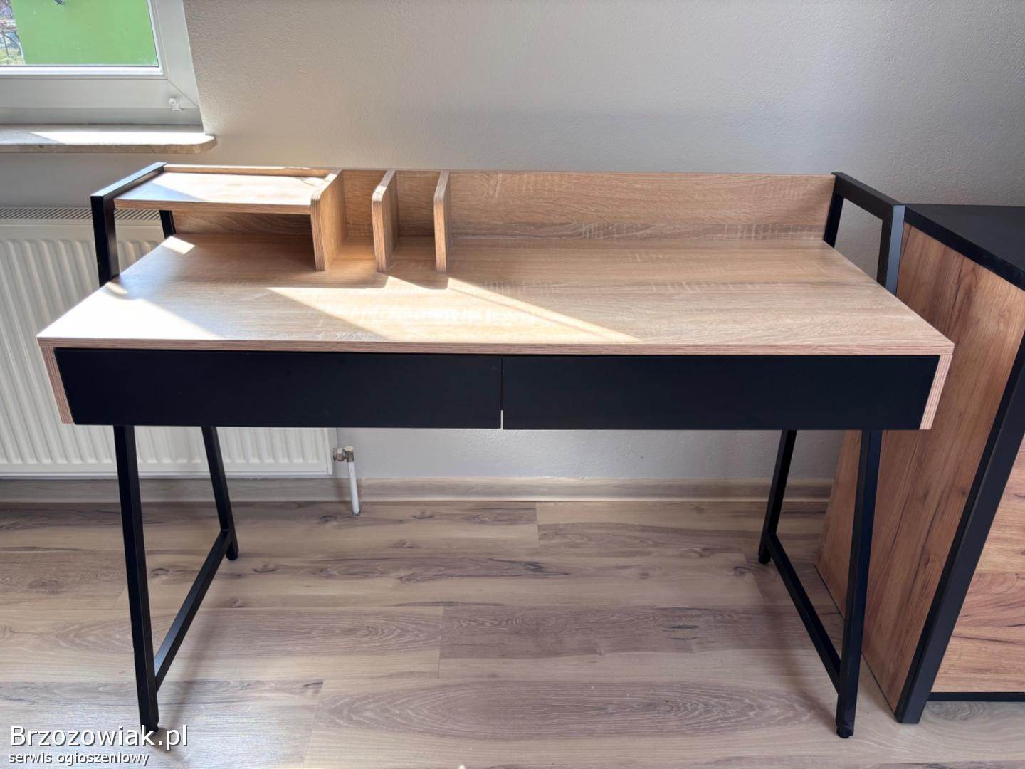 Nowoczesne biurko w stylu loftowym z drewnianym blatem i czarną konstrukcją. Posiada dwie pojemne szuflady oraz praktyczną nadstawkę na dokumenty i akcesoria. Stabilne i funkcjonalne, idealne do pracy lub nauki.