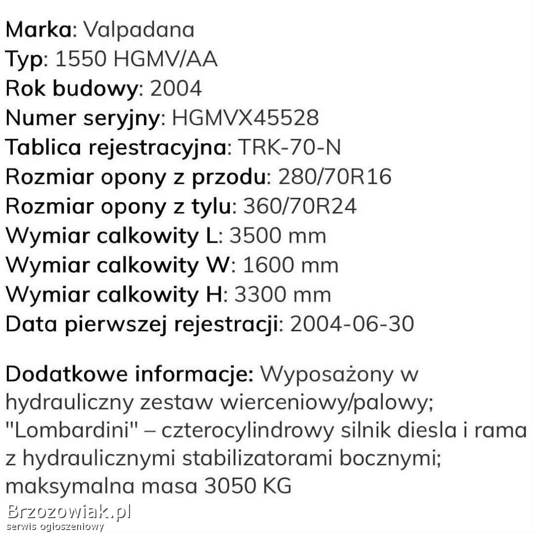 Sprzedam Zestaw wiertniczy włoskiej marki Valpadana 48KM 4x4 3000 MTG, 2004 rok, sprowadzony z Holandi do rejestracji wszystko sprawne, cena 80. 000 netto tel. 603632220