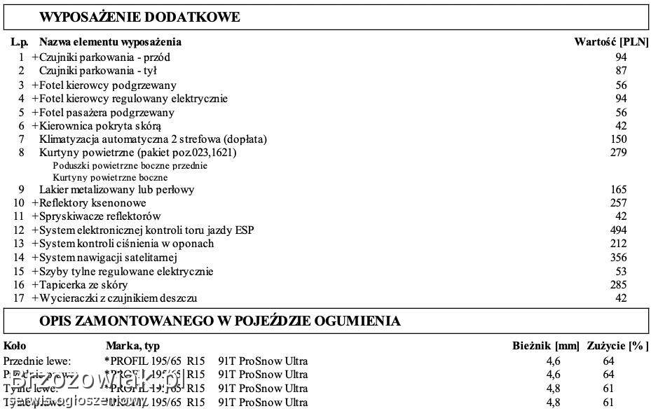 Wyposażenie: ABS, alufelgi, klimatyzacja, komputer, ksenony, podgrzewane fotele, centralny zamek, poduszka powietrzna, czujnik deszczu, czujnik parkowania, radio / CD, el. lusterka, skórzana tapicerka, el. szyby, system nawigacji, ESP, światła przeciwmgłowe, immobiliser, kierownica wielofunkcyjna, wspomaganie kierownicy
