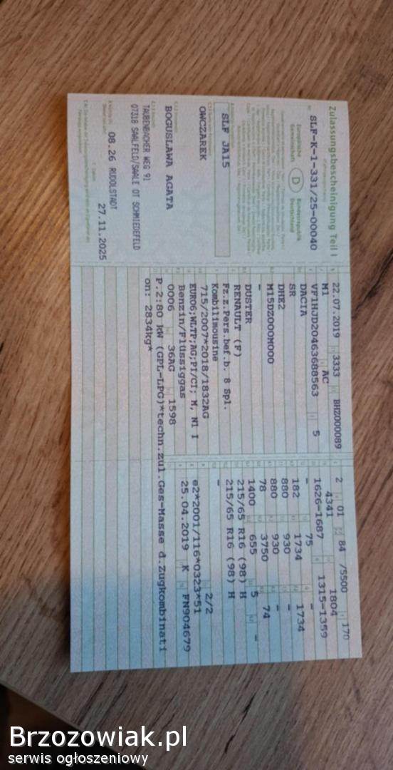 Posiadam na sprzedaż zadbany samochód marki Dacia Duster z silnikiem 1. 6 o mocy 108 koni z fabryczną instalacją gazową. Dacia zakupiona w niemieckim salonie w 2019 roku, użytkowana od nowości przez jednego właściciela. Aktualny przebieg 108 tys. kilometrów. Samochód zadbany, filtry i oleje wymieniane na bieżąco, serwisowany w ASO, dzięki czemu można sprawdzić całą historię pojazdu od nowości. Dacia posiada niemiecki dowód rejestracyjny, aktualne ubezpieczenie i przegląd, można się nią poruszać po drodze. Auto aktualnie ma założone opony zimowe na felgach stalowych plus kołpaki, dokładam opony letnie na alufelgach. Samochód od prywatnej osoby.