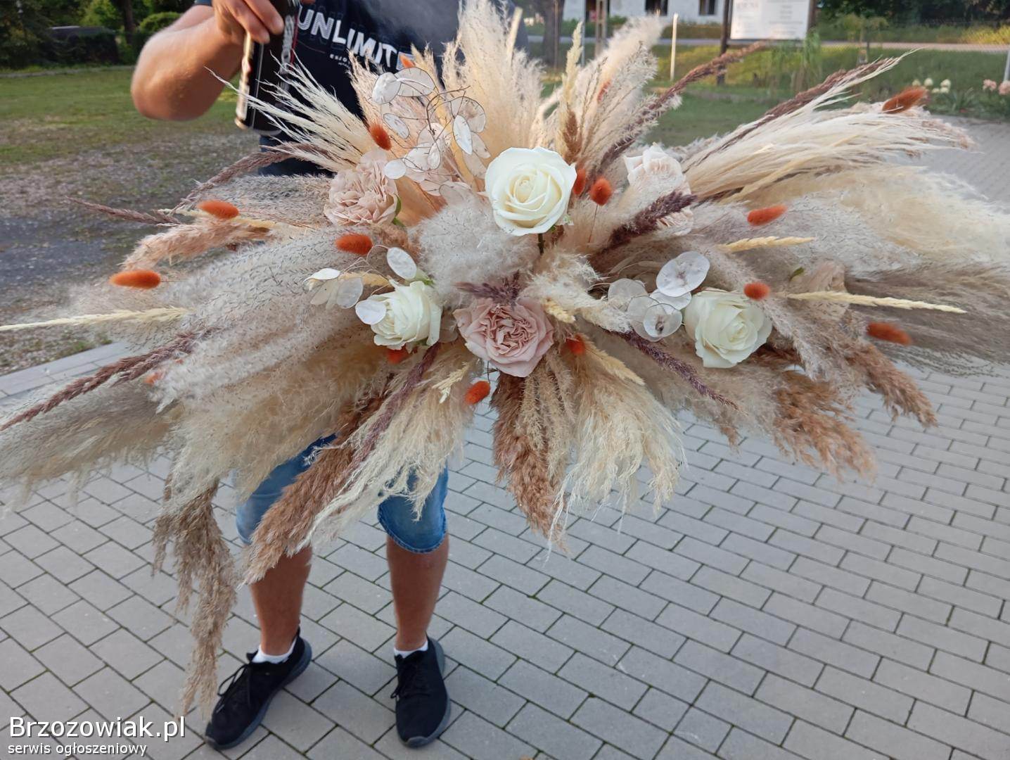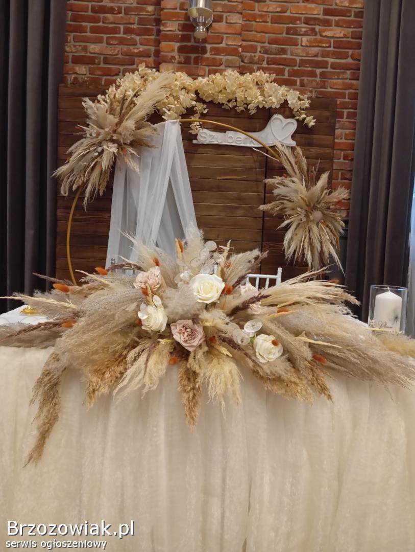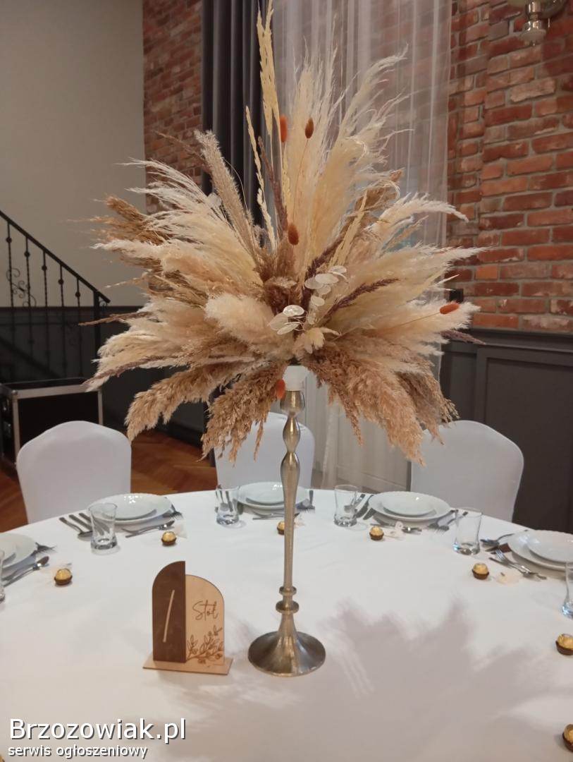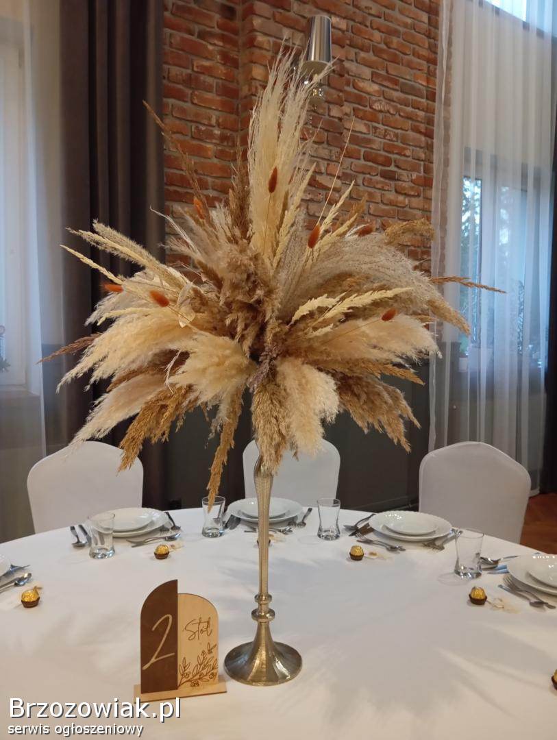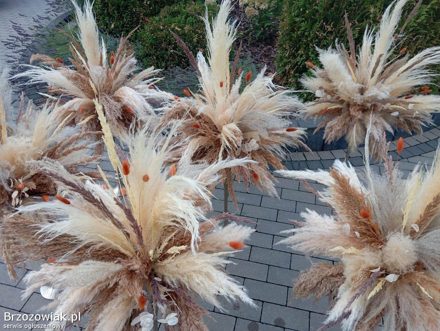Piękne dekoracje ślubne wykonane z suszonych traw pampasowych. Idealne rozwiązanie na wyjątkowe wesele w stylu boho. Zdjęcia robione telefonem - nie oddają ich prawdziwego uroku.