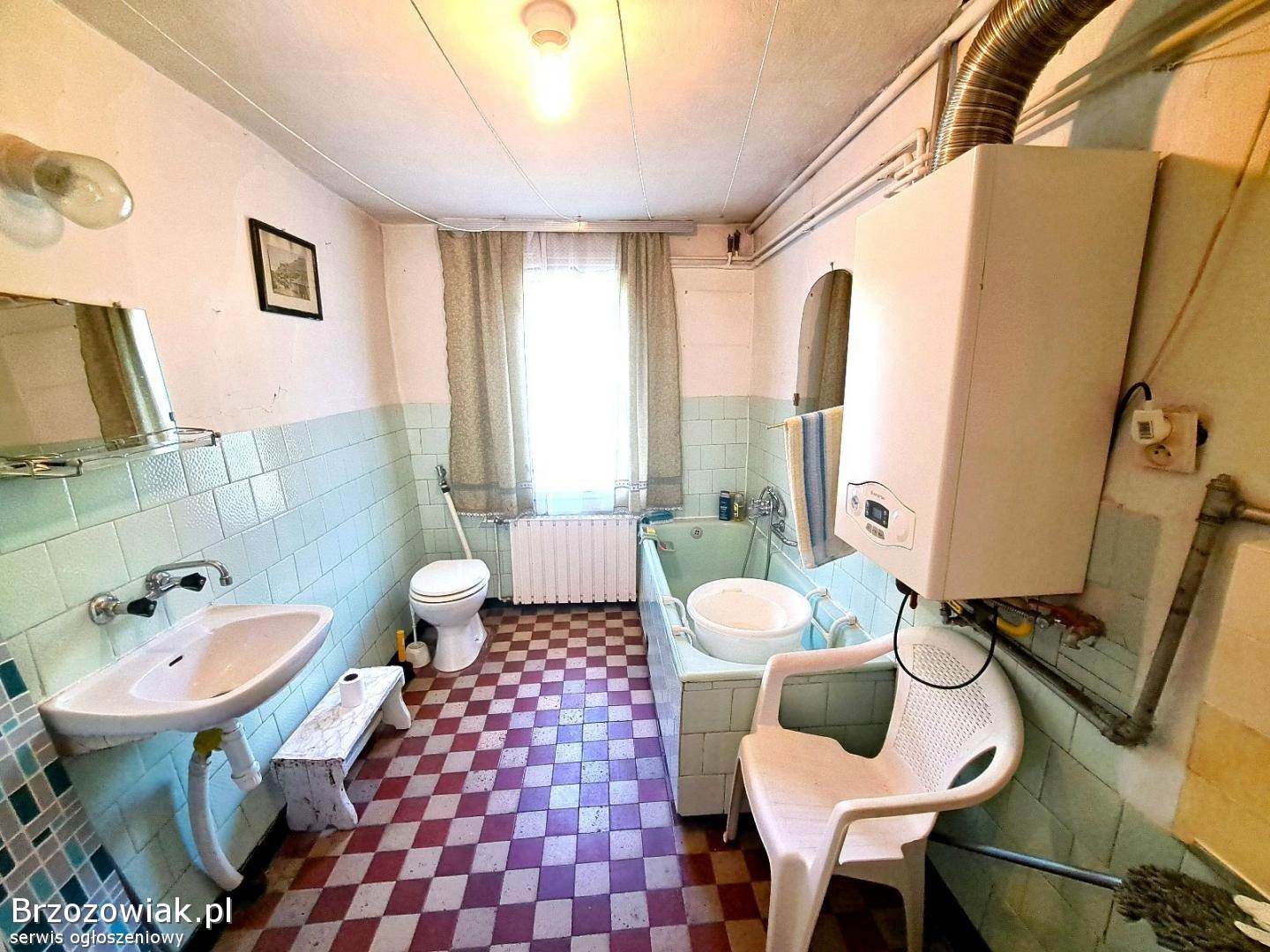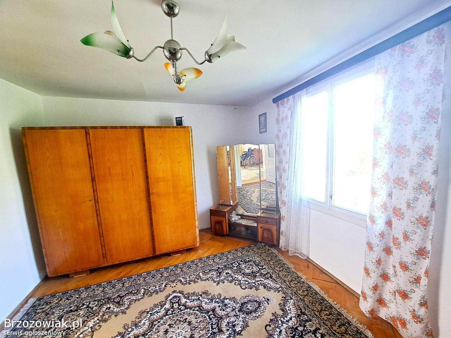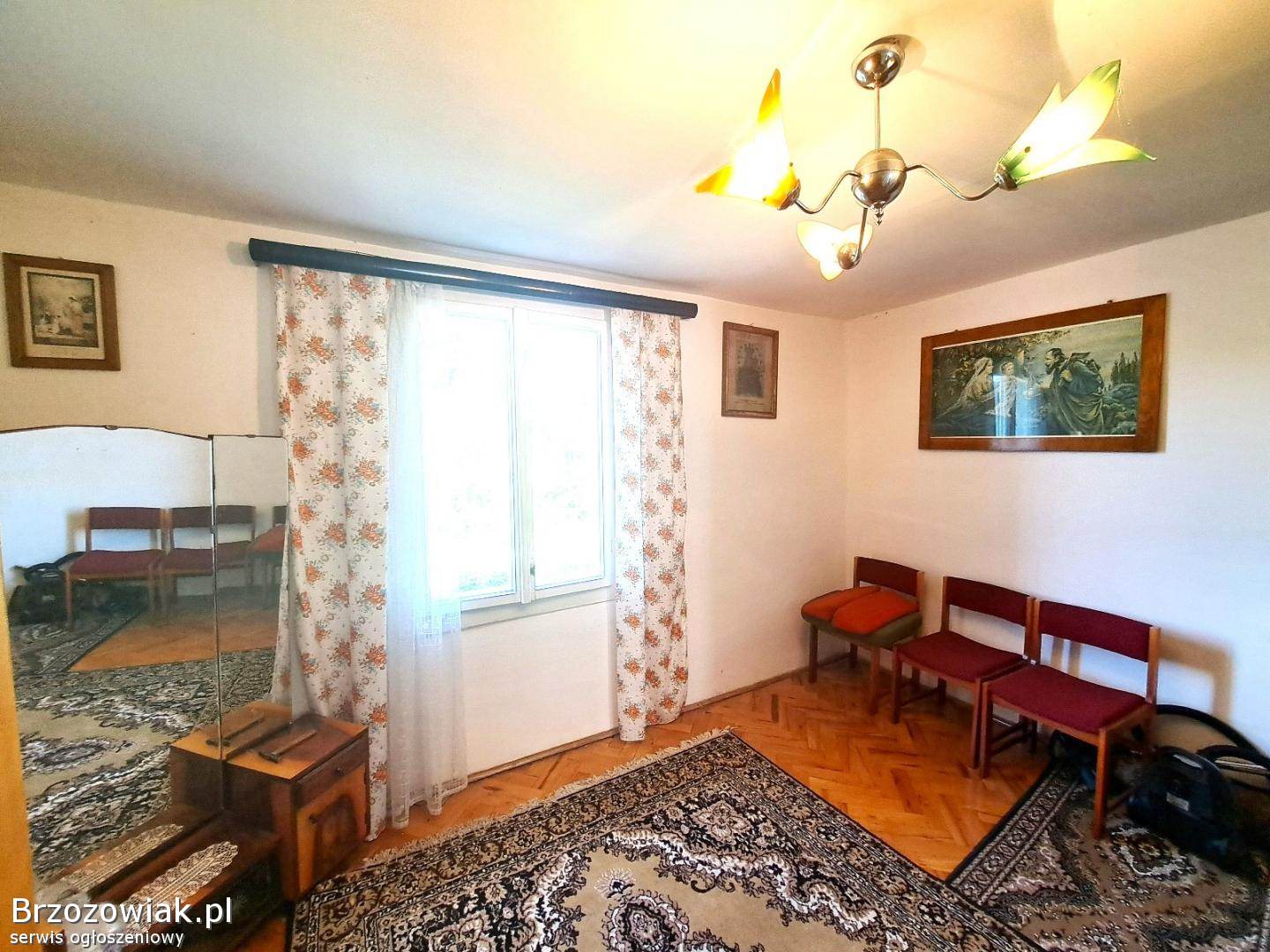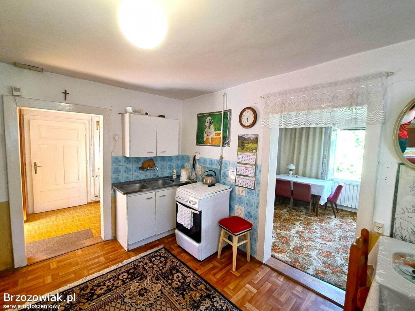 W budynku do dyspozycji mamy 3 pokoje, sień, kuchnię z jadalnią, łazienkę z wanną i WC oraz piwnicę. Okna oraz drzwi zewnętrzne i wewnętrzne starego typu. Media: prąd, gaz, wodociąg i kanalizacja miejskie. W łazience piec gazowy 2-funkcyjny marki Ariston. Jeden pokój, kuchnia z jadalnią, łazienka i korytarz posiadają centralne ogrzewanie. Pozostałe dwa pokoje ogrzewane są piecem kaflowym. Działka lekko pochyła, przylegająca do ulicy asfaltowej, z zagospodarowaną zielenią i miejscem parkingowym Na terenie posesji znajduje się budynek gospodarczy o powierzchni ok. 68 mkw. , w stanie do wyburzenia lub remontu.