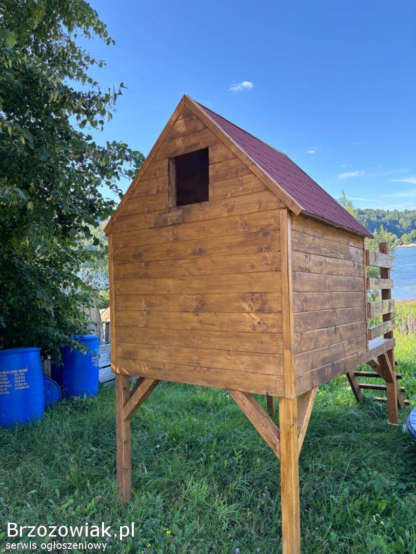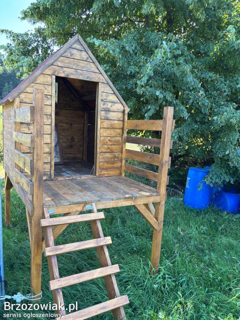 Drewniany domek ogrodowy w dobrym stanie, idealny dla dzieci do zabawy na świeżym powietrzu. Solidna konstrukcja z drewna, z drabinką. Umieszczony na trawie wśród zieleni drzew, tworzy przytulne miejsce do odpoczynku i zabawy.