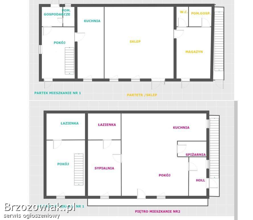 Media: prąd, szambo, woda ze studni. Ogrzewanie: piec na paliwo stałe. Budynek ocieplony styropianem. Dach ocieplony wełną mineralną i pokryty blachą. Stan techniczny dobry. Do częściowego remontu l. b odświeżenia. W sąsiedztwie domy mieszkalne jednorodzinne. Nieruchomość znajduje się przy drodze. Świetna widoczność, idealne miejsce dla usług, handlu lub gastronomii. Parter (dawny sklep) z wejściem od ulicy. Mieszkanie również na parterze z niezależnym wejściem. Drugie (większe) mieszkanie na piętrze, przestronne z osobnym wejściem z drugiej strony budynku. Świetny jako odrębny lokal mieszkalny.