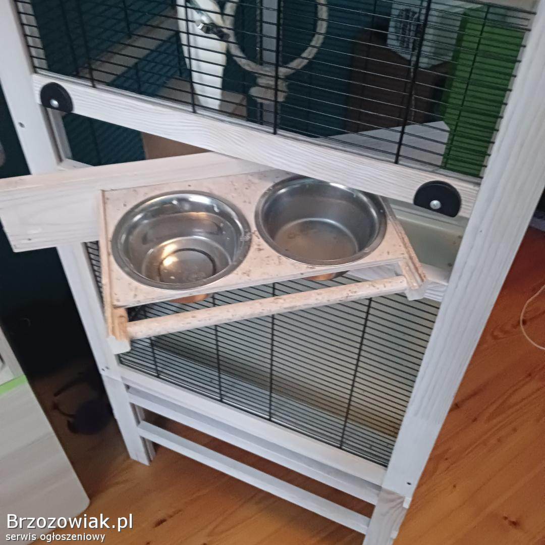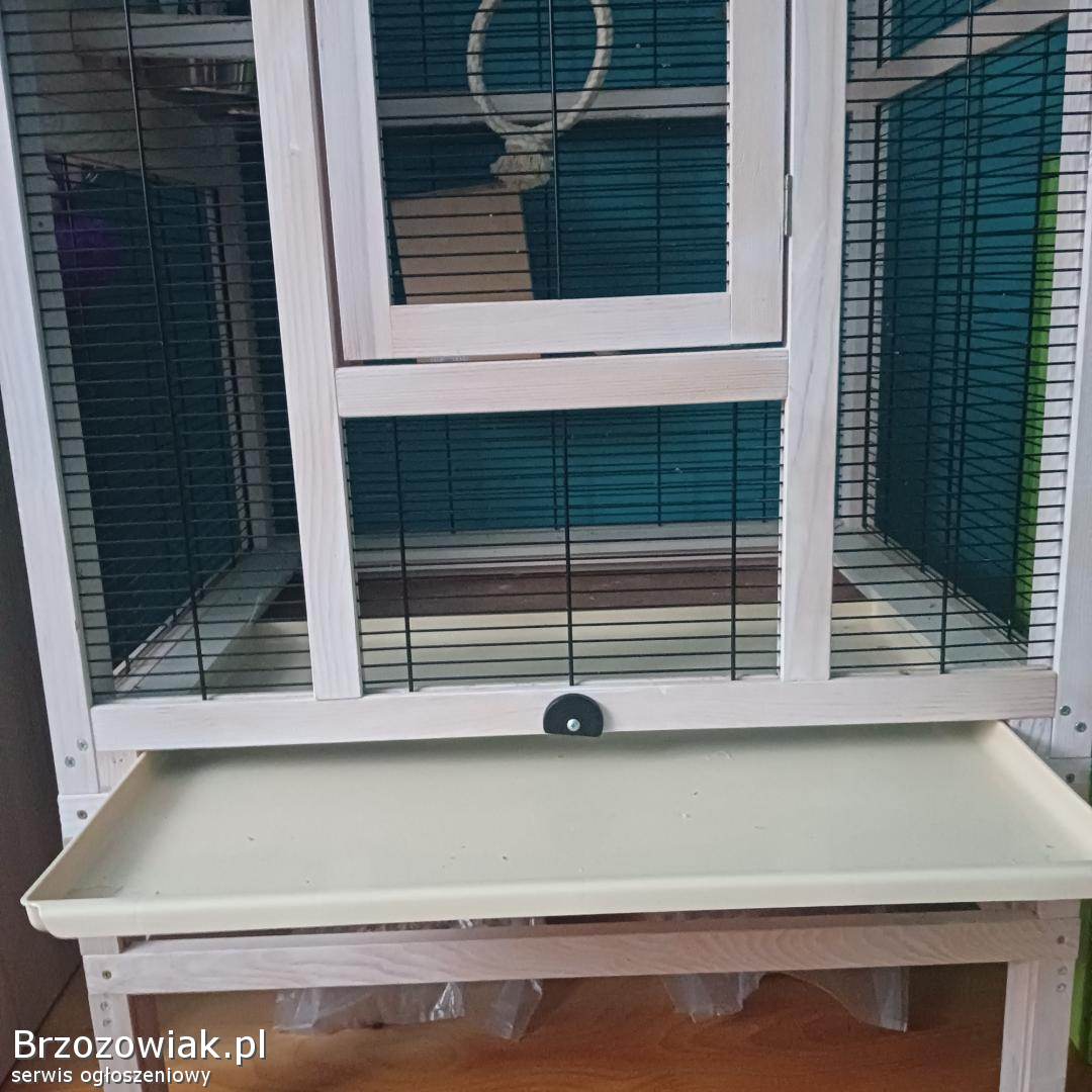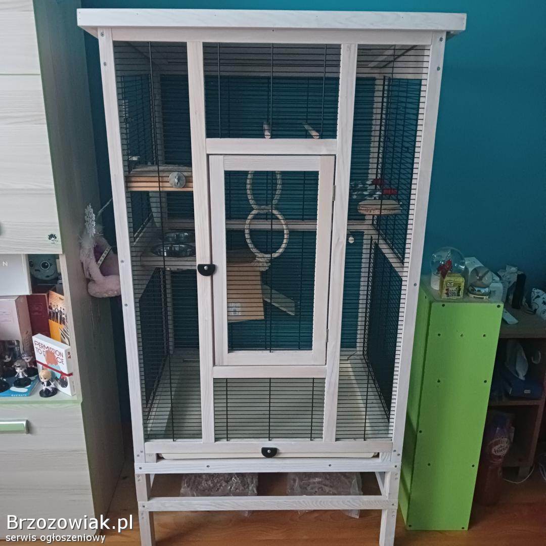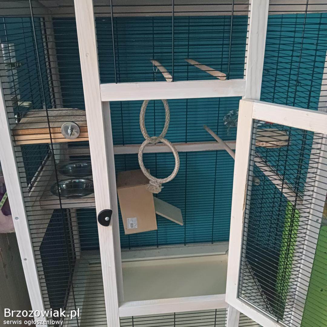 Drewniana klatka dla ptaków dużych i małych - używana - o wymiarach Szerokość 76, 5 cm, wysokość 153 cm, głębokość 82 cm. Z wyposażeniem m. in. : obrotowa stacja karmienia, dozownik wody, wyciągana szuflada na piasek w celu ułatwienia czyszczenia, regulowane 3 grzędy i wiele innych widocznych na zdjęciach.