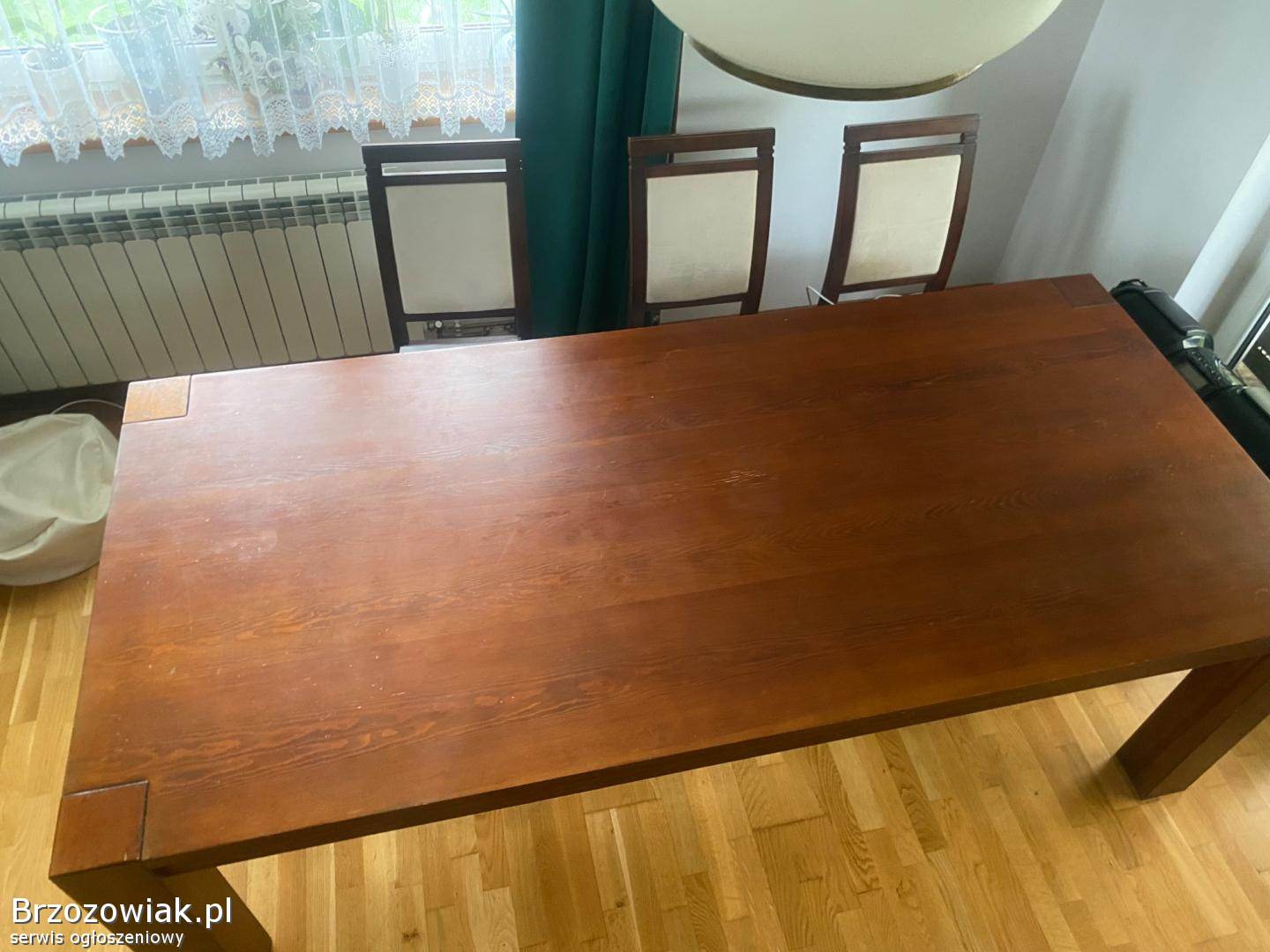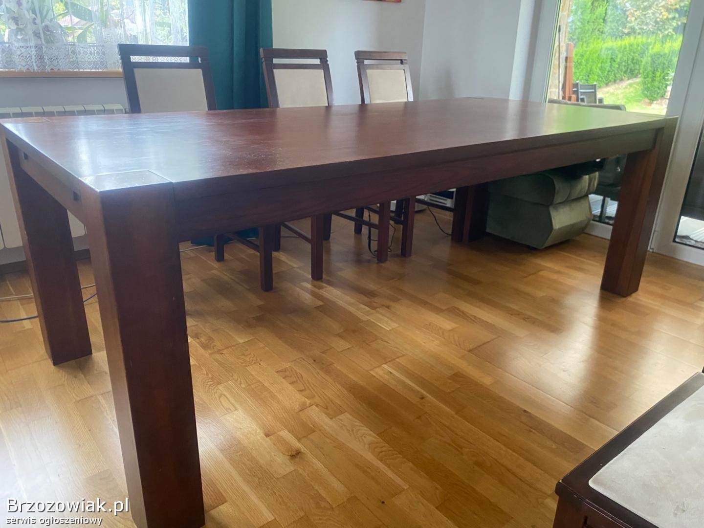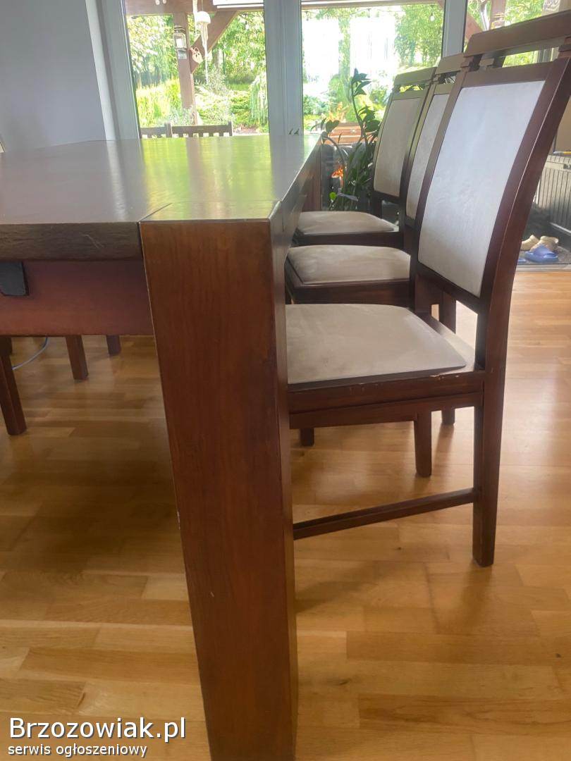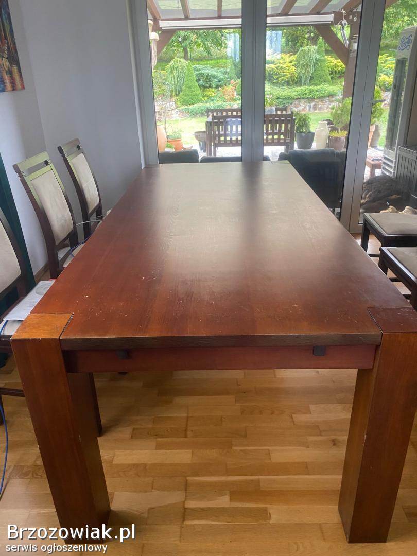 Sprzedam drewniany, masywny stół do jadalni, salonu oraz 6 drewnianych krzeseł. Stół o wymiarach 220x100. Kolor orzech, ciemny dąb. Stół się nie rozkłada. Krzesła z jasnym, kremowym, welurowym obiciem. Polecam, cena do negocjacji. Odbiór tylko osobisty. Tel. 605372956
