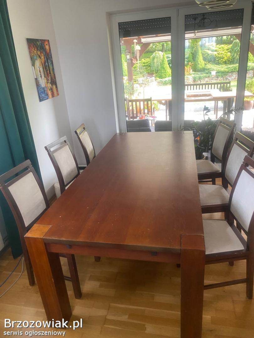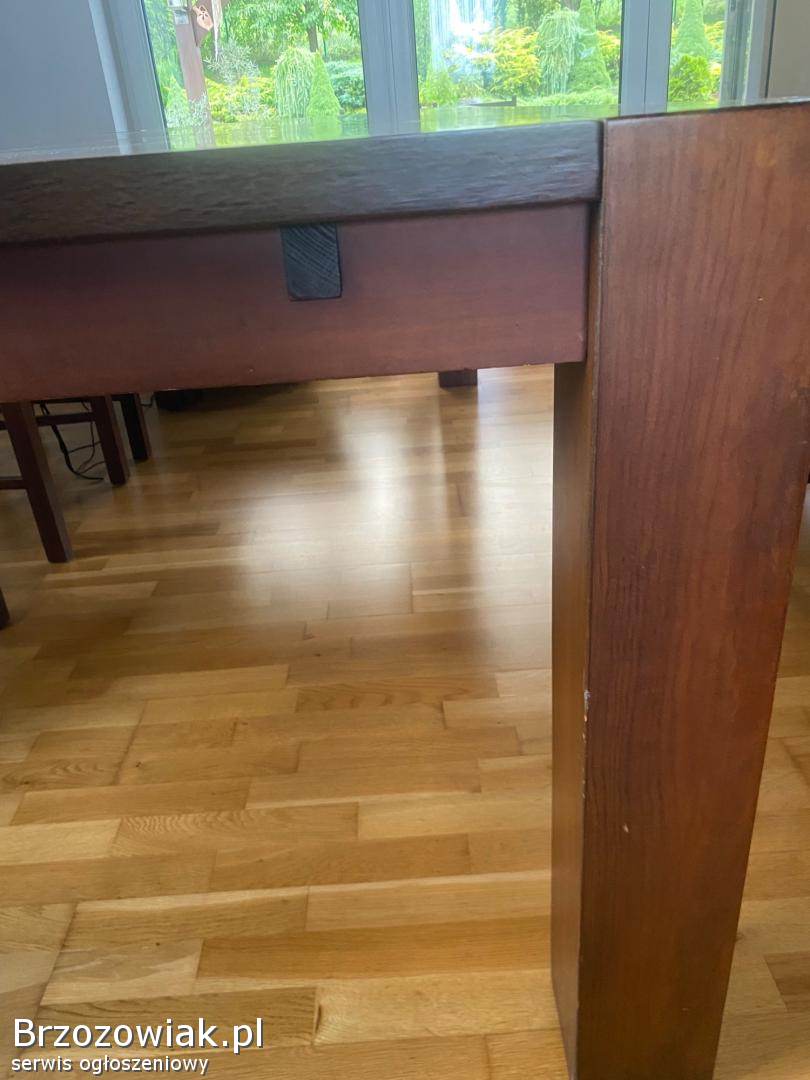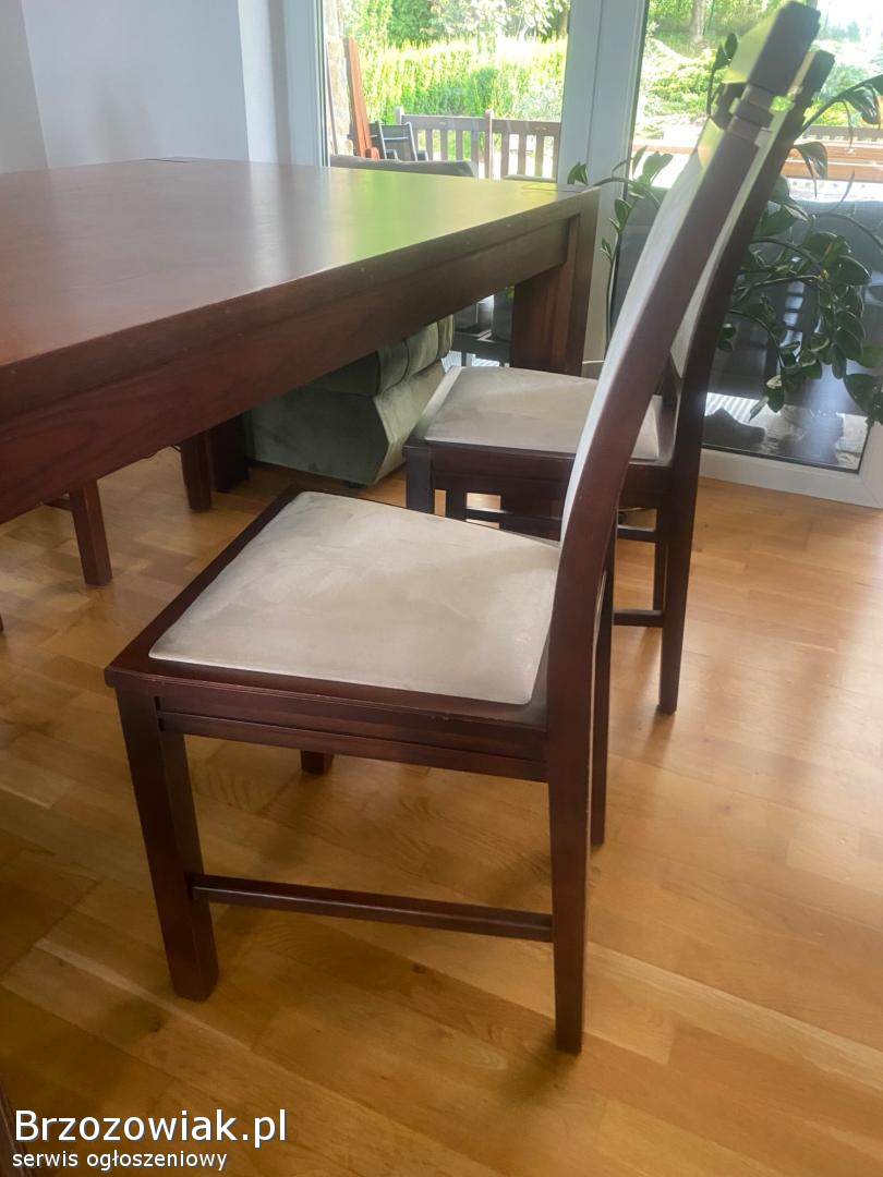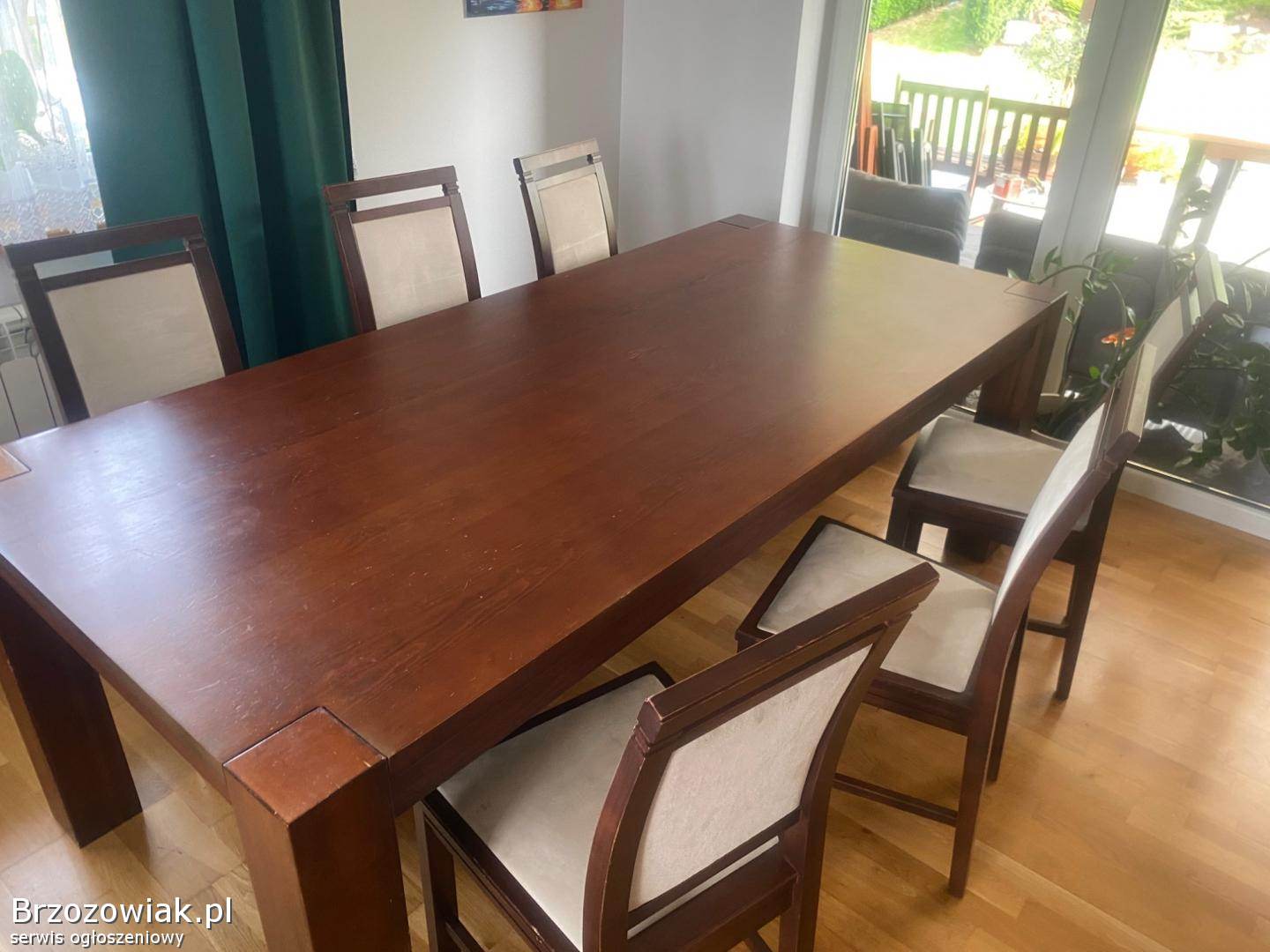 Sprzedam drewniany, masywny stół do jadalni, salonu oraz 6 drewnianych krzeseł. Stół o wymiarach 220x100. Kolor orzech, ciemny dąb. Stół się nie rozkłada. Krzesła z jasnym, kremowym, welurowym obiciem. Polecam, cena do negocjacji. Odbiór tylko osobisty. Tel. 605372956
