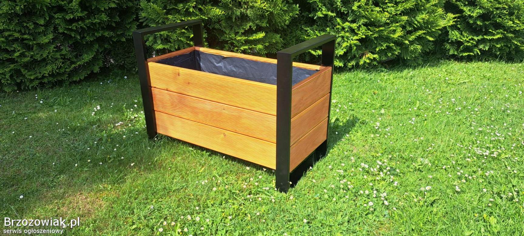 Mam do sprzedania donice w stylu loft, wymiary 100x50x70(długość/szerokość/ wysokość ) konstrukcja malowana proszkowo na czarno wykonana z profila 70x20, oraz deski tarasowej pomalowanej impregnatem. Doniczka posiada masywne dno na wysokości drugiej deski od spodu.