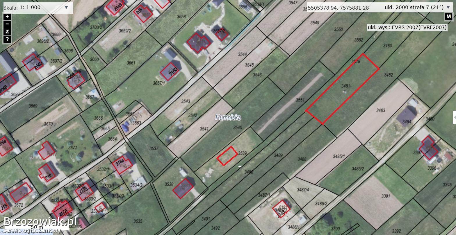 Sprzedam działkę budowlaną nr 3481 w miejscowości Humniska o powierzchni 11 ar z wydanymi warunkami zabudowy na budynek mieszkalny jednorodzinny. Dojazd drogą gminną. Sieć gazowa, kanalizacyjna, energetyczna w odległości około 50 / 70 m. Wymiary działki to około 17, 5 m / 64 m. Cena za ar 3200 zł.