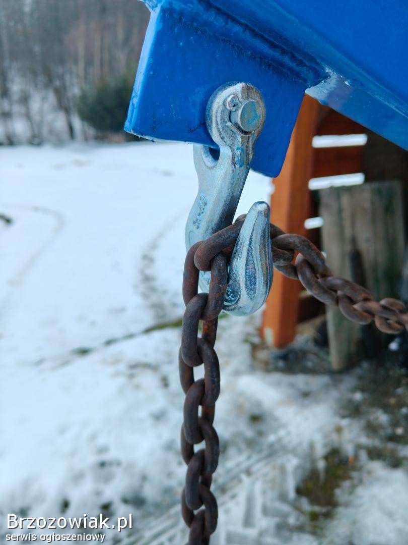 Spód orginalna nowa listwa podnośnika grubości 25mm, wieżyczka z profila 60x60x4, zastrzały 60x60x4, wysięgnik z profila 80x50x5 długości 2m + ucho zrobione z nowej końcówki cięgła, dwa haki dziesiątki 2. 45t wąskie dzięki czemu dobrze klinuje się łańcuch i nie trzeba kombinować przy skracaniu tylko wystarczy zarzucić łańcuch w hak, uchwyty pod haki płaskownik 9mm, sworzeń na wahadle fi 20 pełny zabezpieczony zawleczkami. W komplecie sworzeń z zawleczką i zawleczki do zapięcia pod traktor. ( Na średniej regulacji wieszaków od podnośnika podnosi na +/-240cm do góry.