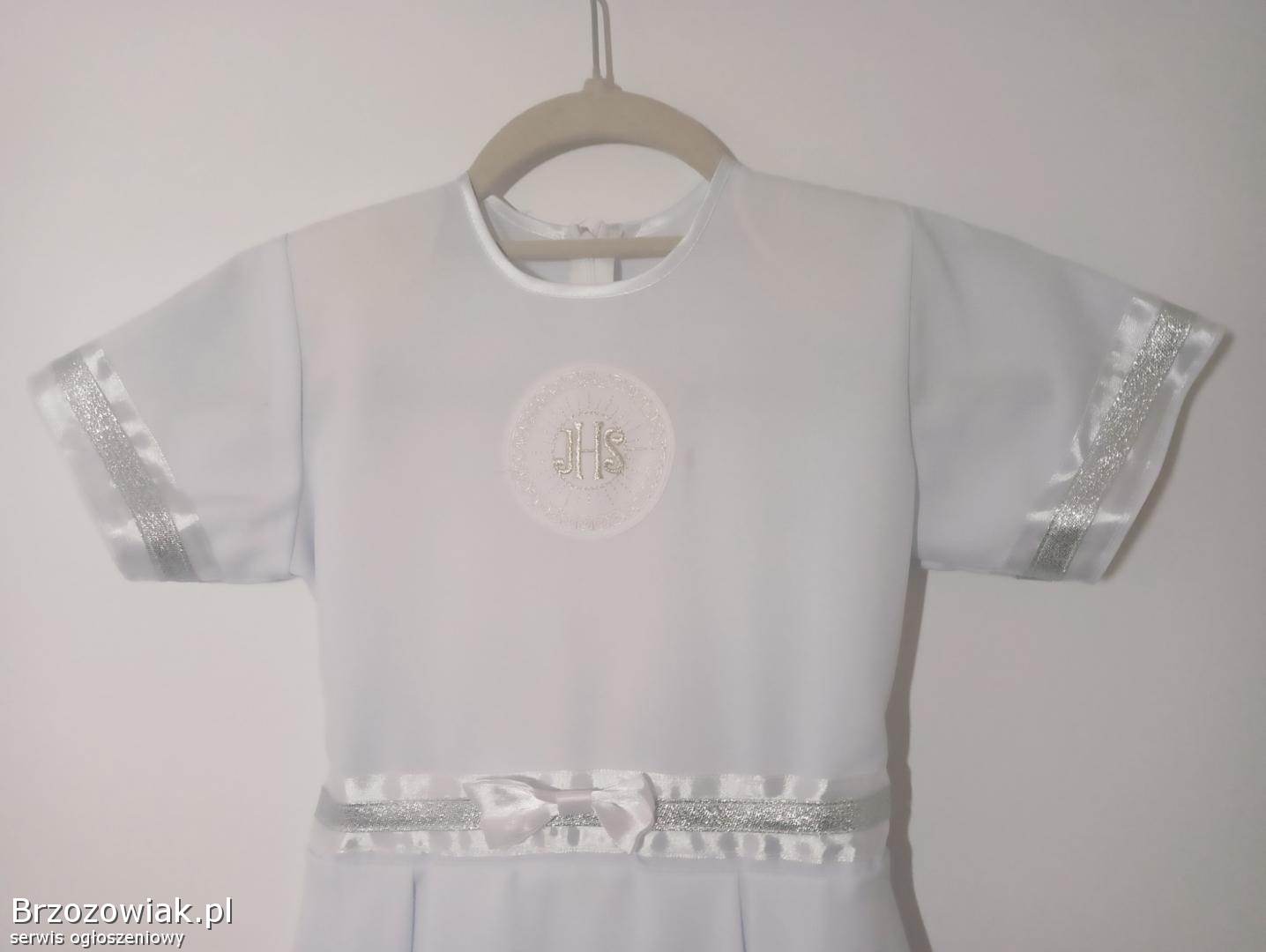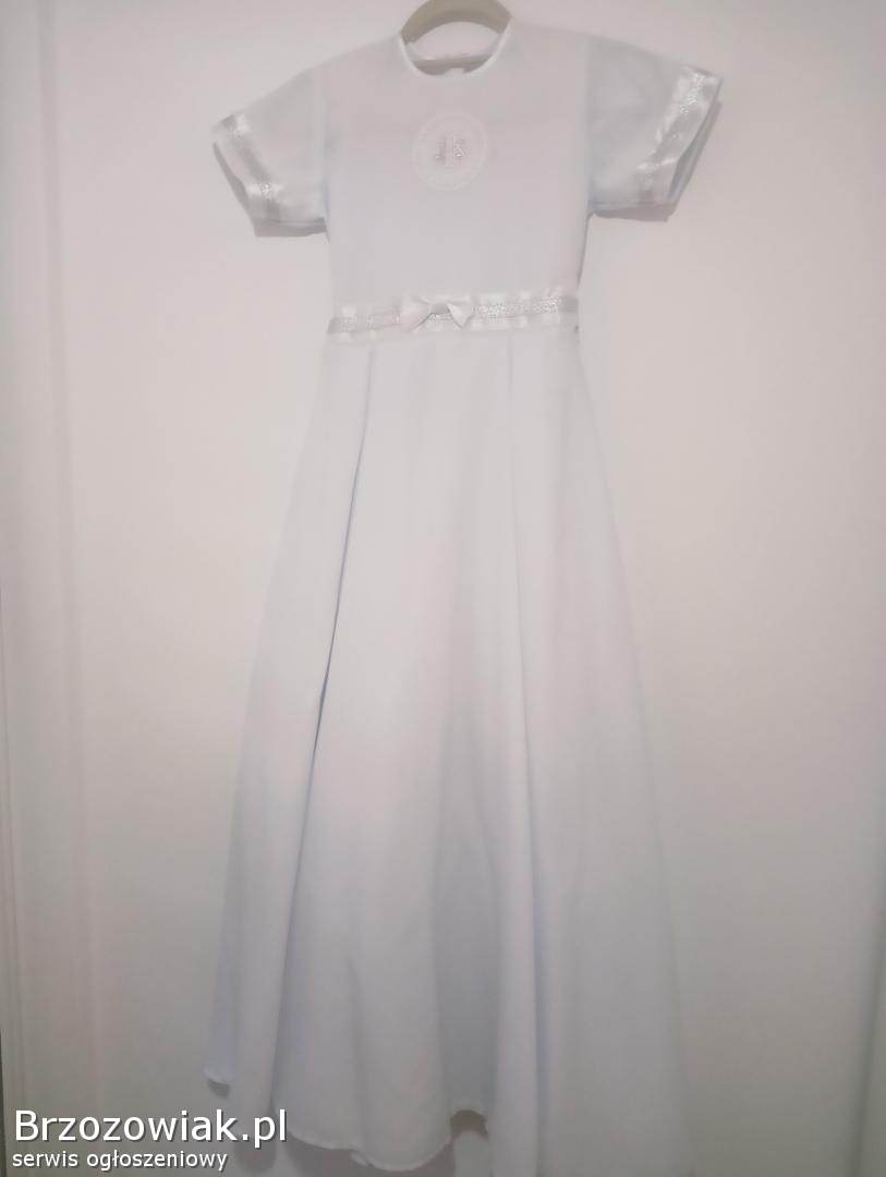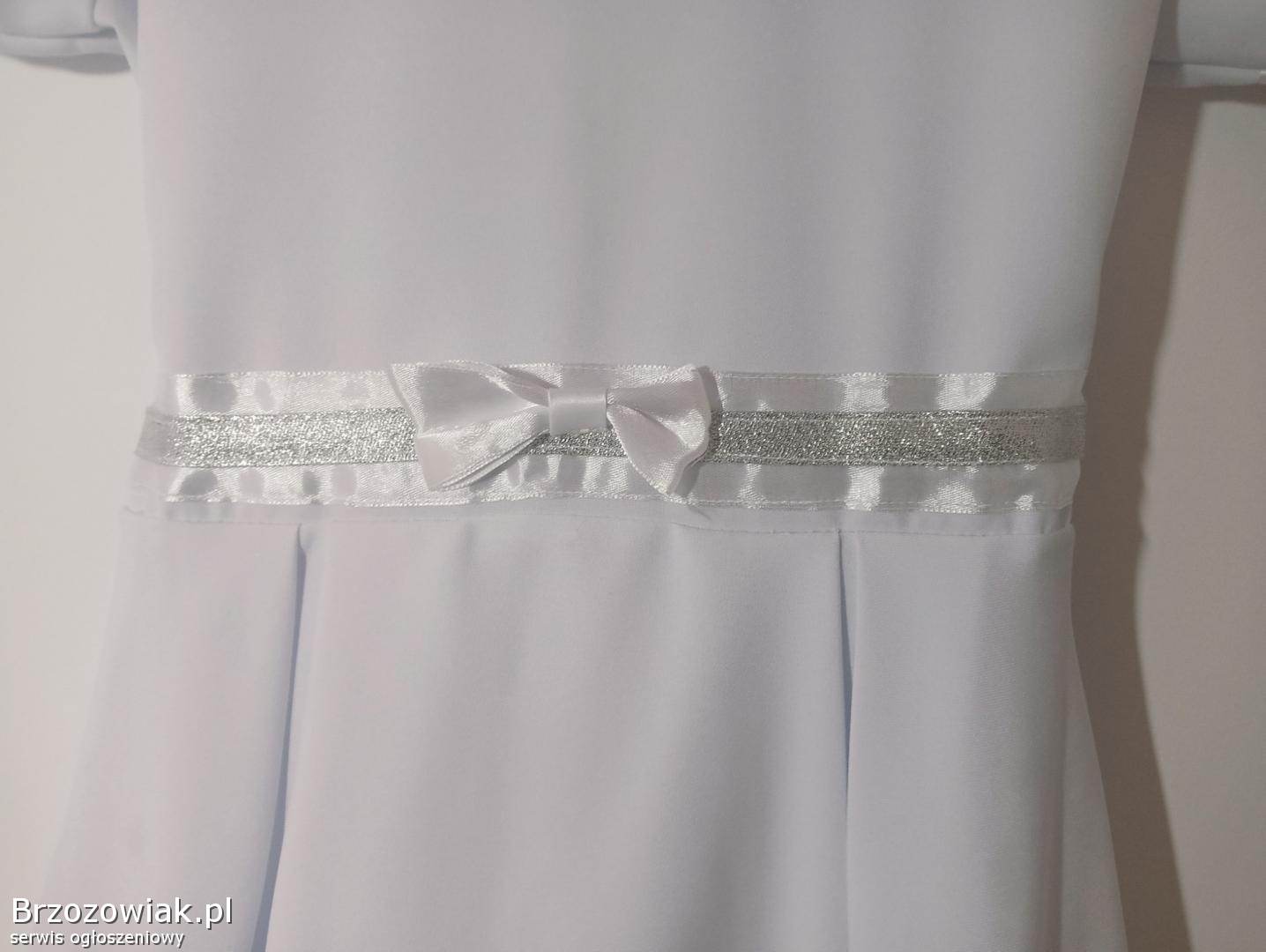Sukienka komunijna w kolorze śnieżnej bieli, idealna na uroczystość Pierwszej Komunii Świętej.