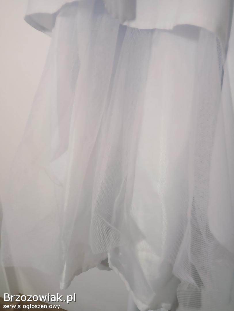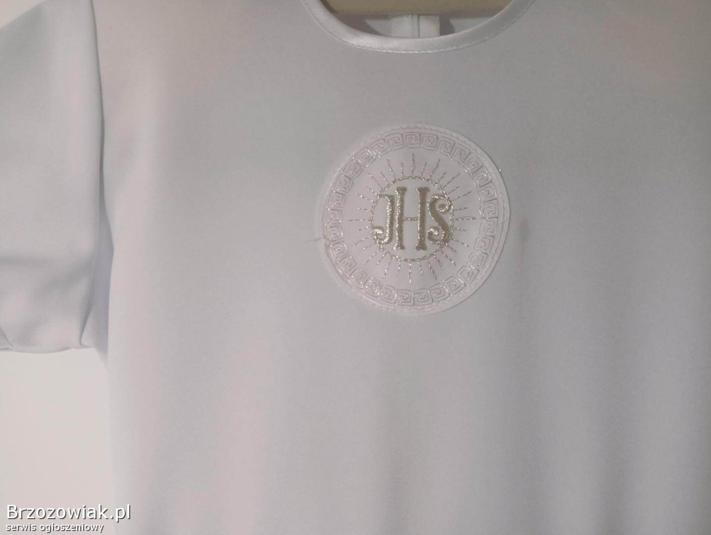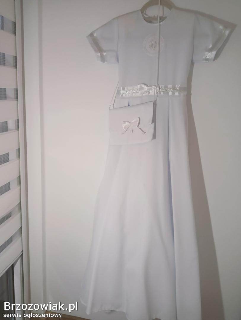 Sukienka komunijna w kolorze śnieżnej bieli, idealna na uroczystość Pierwszej Komunii Świętej.