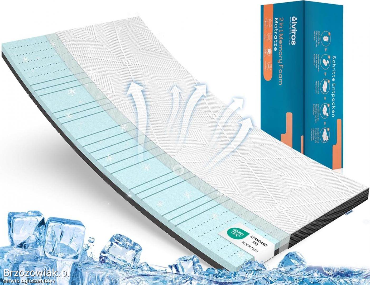 Nakładka na materac o 2 stopniach twardości: materac wierzchni Elviros o grubości 7 cm to innowacyjny produkt z dwoma bokami o różnym stopniu twardości, co jest dobrym rozwiązaniem dla różnych problemów związanych z nieodpowiednią wytrzymałością. Niebieska i miękka warstwa składa się z chłodzącej pianki żelowej memory, która dopasowuje się do konturów ciała, równomiernie rozprowadza punkty nacisku i łagodzi ból ciała.