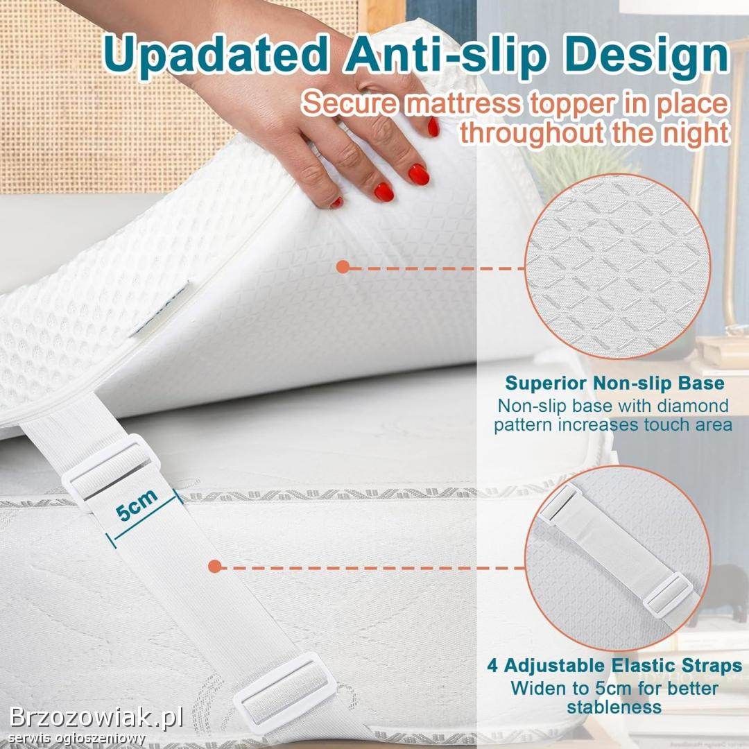 Antypoślizgowa konstrukcja: powierzchnia spodu naszego pokrowca na materac ma unikalny wzór w kształcie rombu, który zwiększa powierzchnię styku. W porównaniu z innymi silikonowymi wypustkami nasza poszewka jest bardziej antypoślizgowa. Regulowane taśmy mocujące o szerokości 5 cm zapewniają, że nakładka na łóżko pozostaje na swoim miejscu nawet przy silnym ruchu.