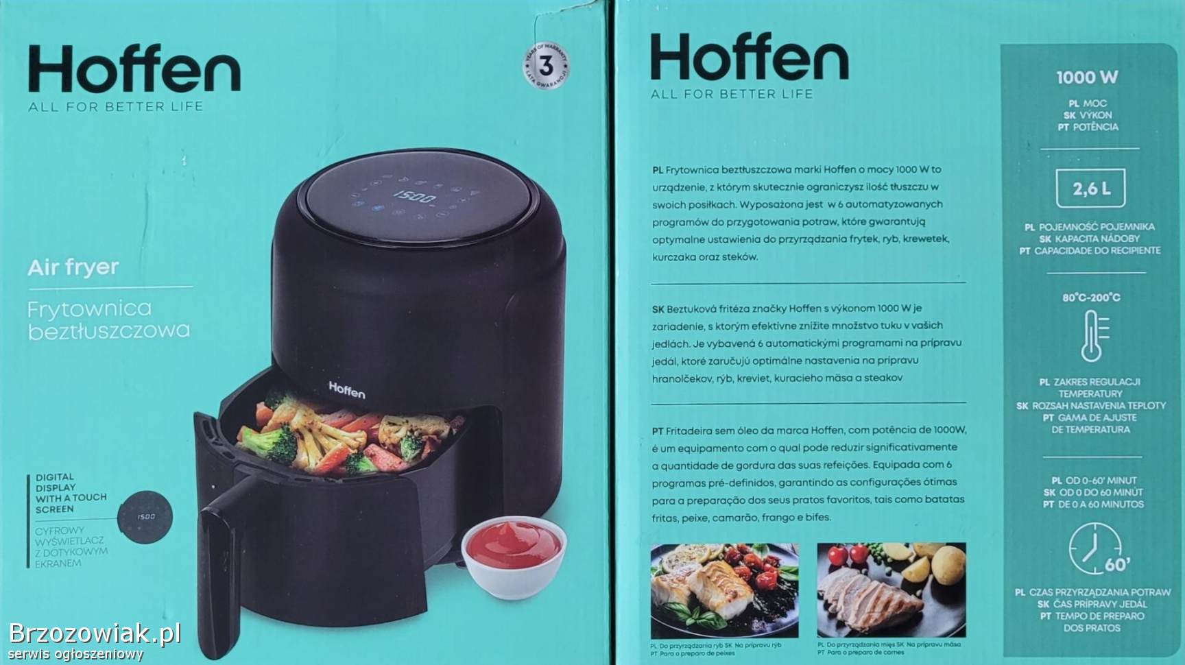 Sprzedam jak tytule airfryer posiada dotykowy panel sterujący (prosty w obsłudze) niskie zużycie prądu (1000W), małe gabaryty a przy jednocześnie sporej pojemnosci 2, 6l, 3 letnią gwarancję.