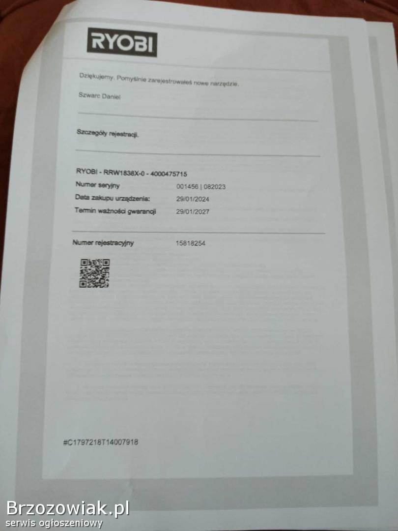 Sprzedam akumulatorową grzechotkę RYOBI RRW1838X z silnikiem bezszczotkowym. Sprzęt użyty kilka razy, wszystko sprawne, stan idealny. Moment dokręcania 75 NM. Gwarancja do 01. 2027 roku.
