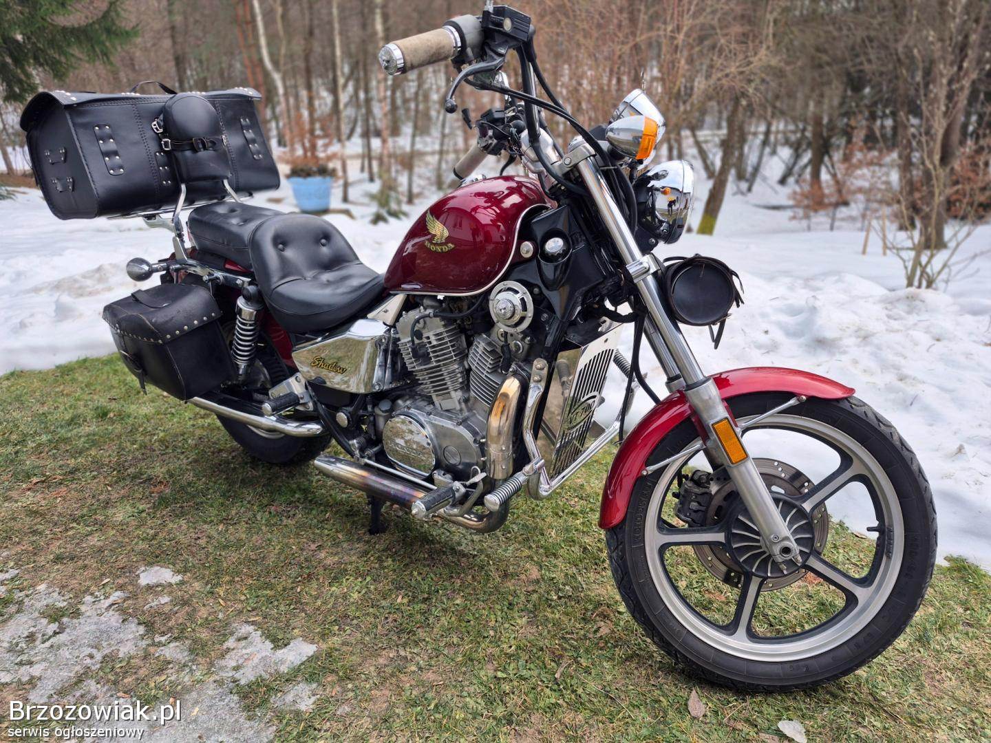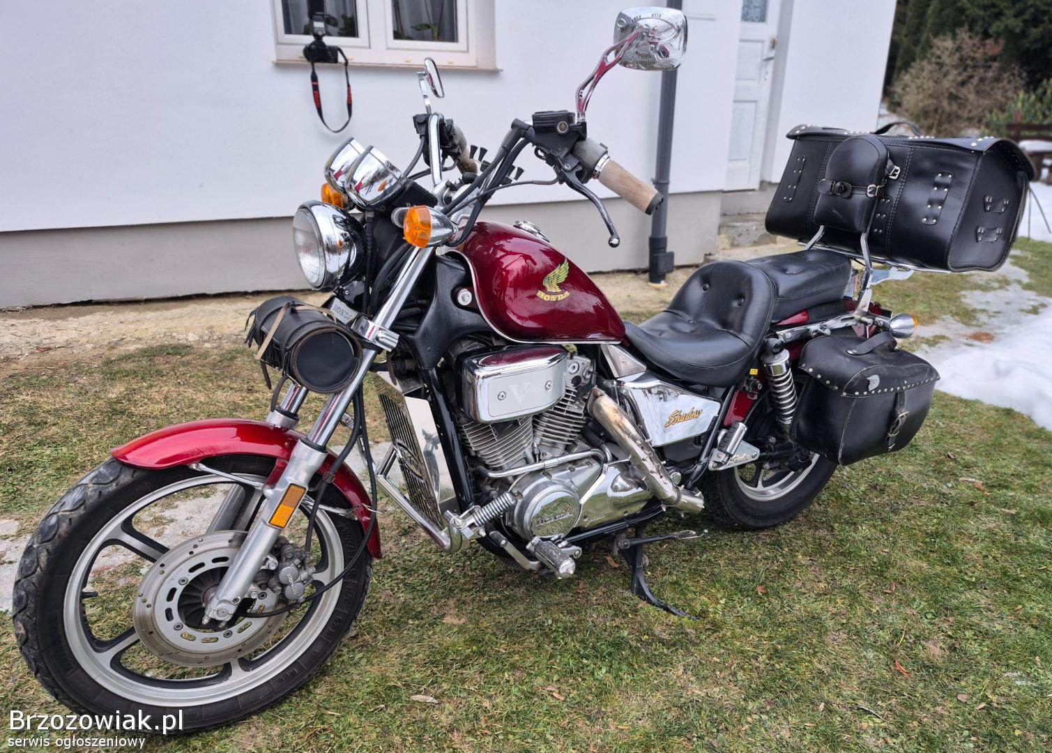 Sprzedam motocykl Honda Shadow VT 700 Twin. Rok produkcji 1986. Zachowany w bardzo dobrym stanie technicznym. Silnik pracuje równo, bez wycieków. Nowa opona tył. Ważne ubezpieczenie i przegląd. Motocykl sprzedaję bez tylnego kufra. Cena do negocjacji.