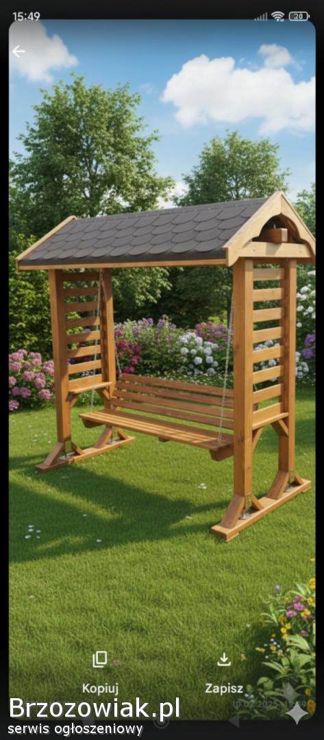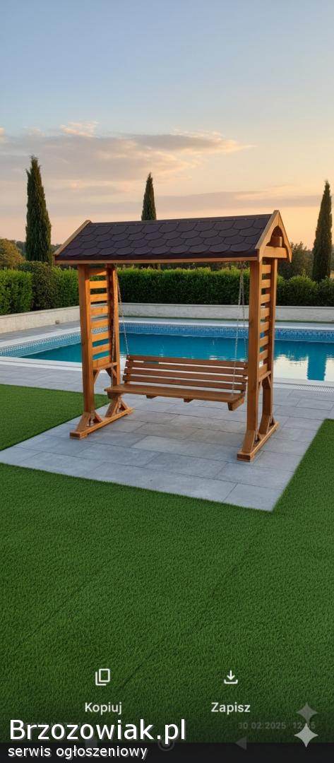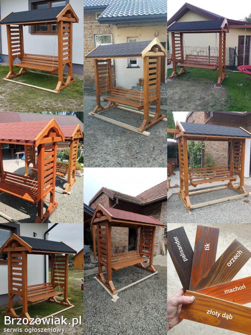 Huśtawka solidnie wykonana z kantówki 10x10, kryta gontem, malowana lakierobejcą sadolin 3 razy cena 2300 zł, Niemalowana 2100 zł, , szerokość siedziska 160 cm. Posiadam transport.