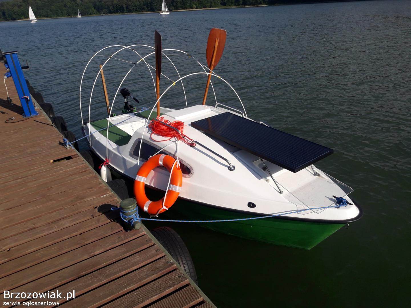 Sprzedam lekki jacht kabinowy BEZ-2 z napędem elektrycznym i ładowarką SOLAR. Dane techn: dł. 4, 20 m, szer. 2, 0 m, ciężar ok. 300 kg, silnik elektryczny zaburtowy 12V - 60 lbs. SOLAR fotovoltaika 140 / 270 W ze sterowaniem komptr. Akumulator 100 Ah TOYAMA, oświetlenie nawigacyjne i wewn. kabiny, miecz obrotowy, zanurzenie 17 cm, 2 miejsca do spania w kabinie, materace w kabinie i na kokpicie, osłona (tzw. bimini) pełna kokpitu na noc, osłona p-ciw słoneczna kokpitu na dzień, pagaje inn, …. Przyczepa – wózek zarejestrowana DMC 650 kg.
