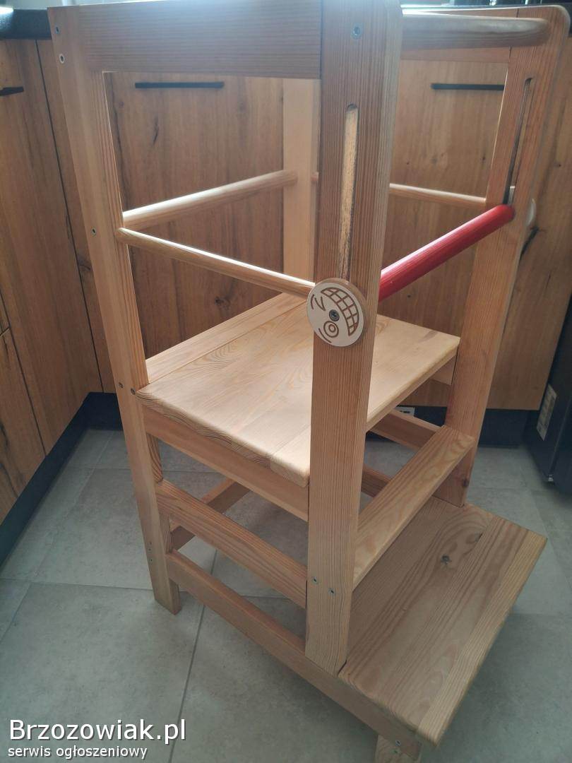 Drewniany, solidny, możliwość regulacji wysokości, zabezpieczenie przed upadkiem.