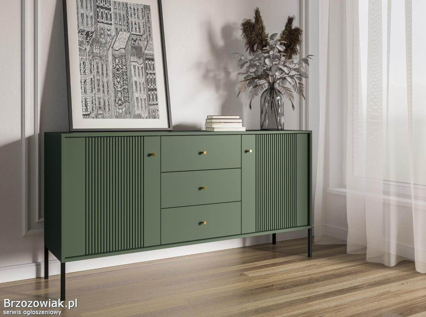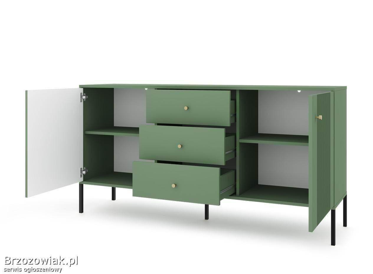 Stylowa i nowoczesna komoda, doskonale wpisująca się w współczesne trendy wnętrzarskie. Posiada wyrazisty, soczysty zielony kolor, który doda charakteru każdemu pomieszczeniu. Konstrukcja komody obejmuje trzy szuflady i jedną dużą, zamykaną przestrzeń z drzwiczkami w pionowe, cienkie żłobienia, co dodaje tekstury i zainteresowania wizualnego. Uchwyty i nóżki wykonane są z kontrastującego metalu, co dodaje elegancji całości. Jest to mebel praktyczny i dekoracyjny, idealny do przechowywania, z łatwym dostępem do zawartości dzięki wygodnym uchwytom. Jego wymiary i proporcje czynią go idealnym wyborem do salonu, sypialni czy korytarza, zapewniając jednocześnie znaczącą pojemność przechowawczą.
