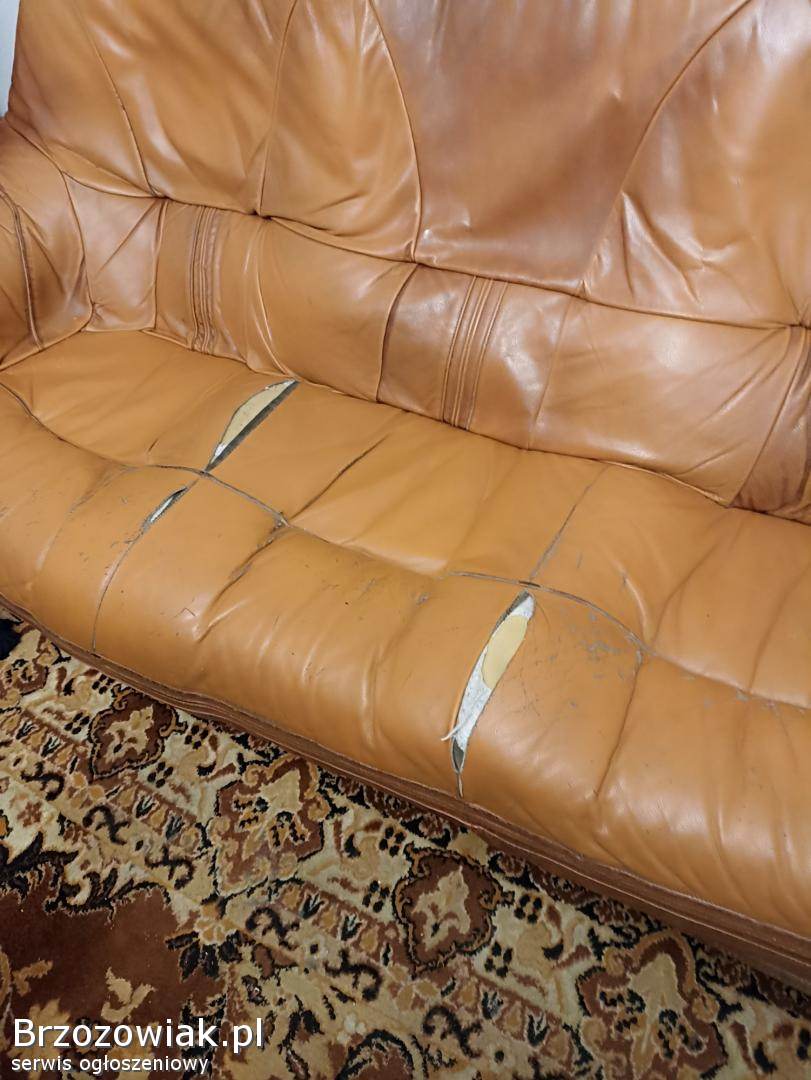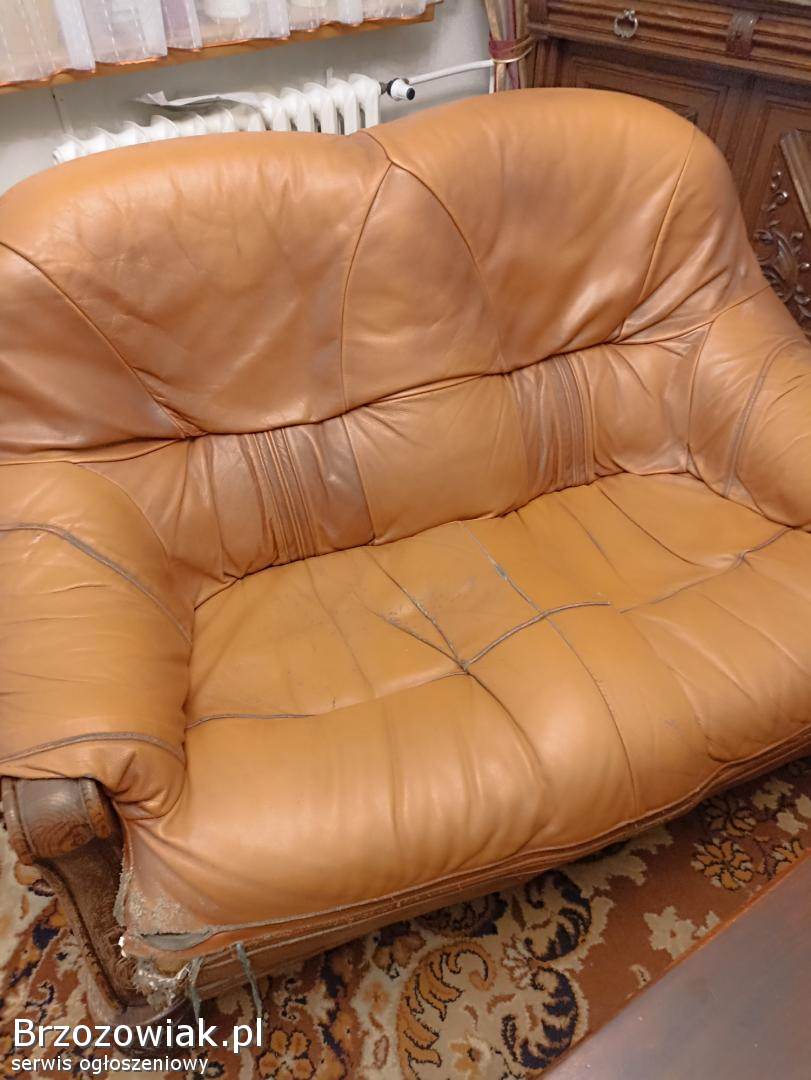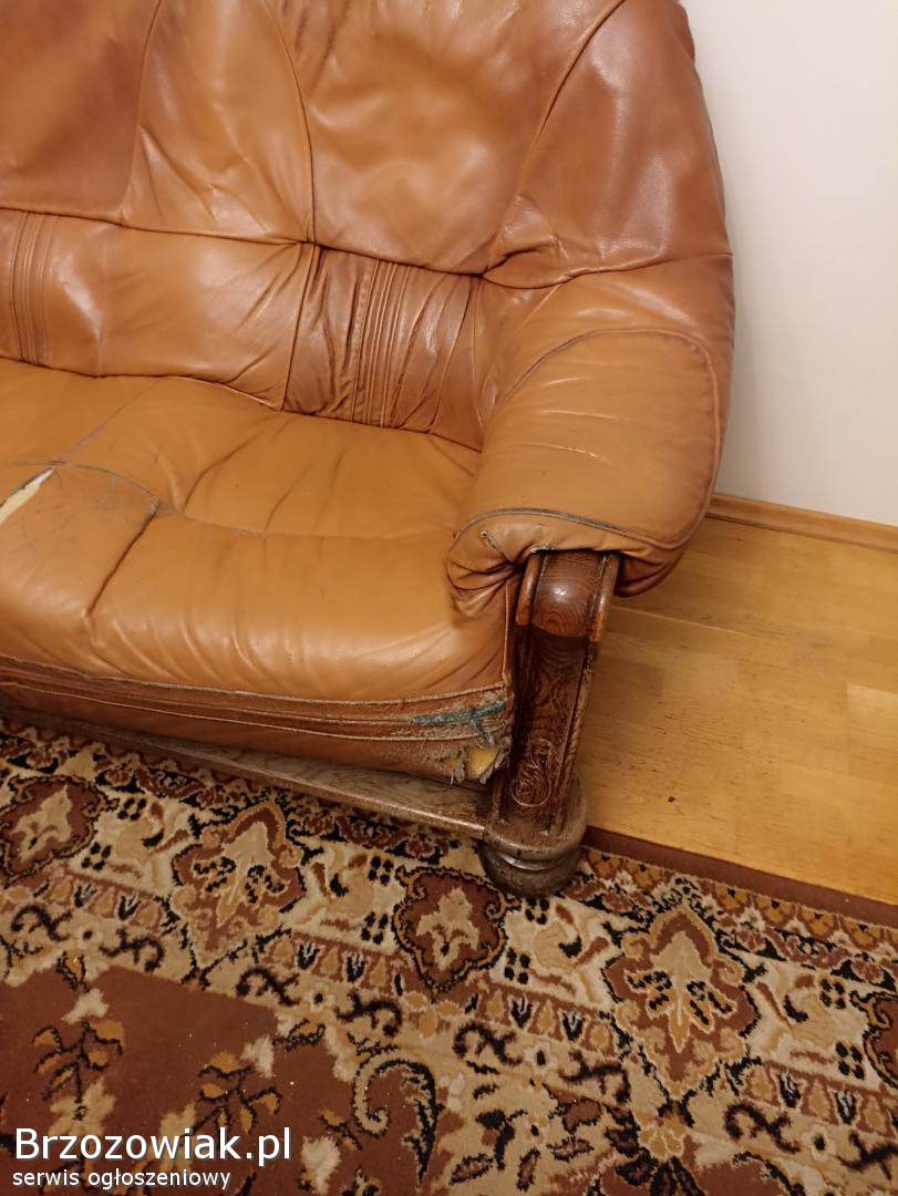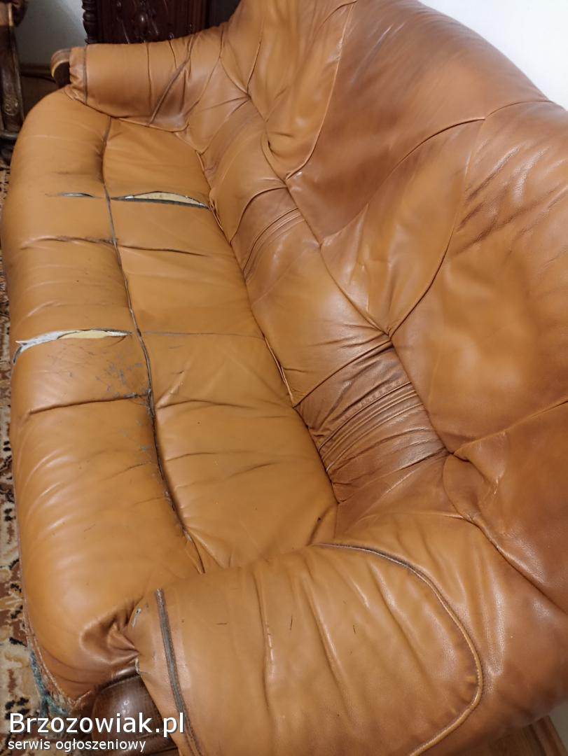 Sprzedam używany komplet wypoczynkowy skórzany sofa 3 osobowa dł 200 cm, sofa 2 osobowa dł 145 cm oraz fotel wysokość mebli 95 cm konstrukcja z drewna dębowego do renowacji, skóry do odnowienia. Odbiór w Krośnie.