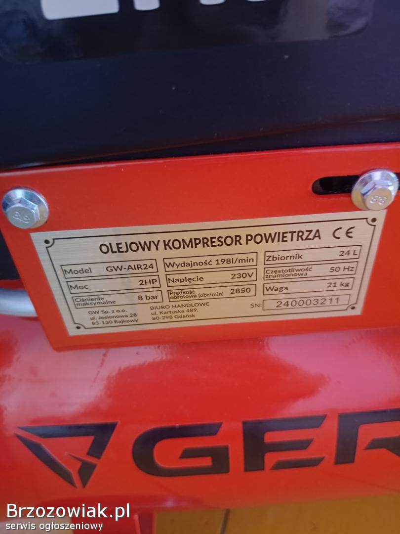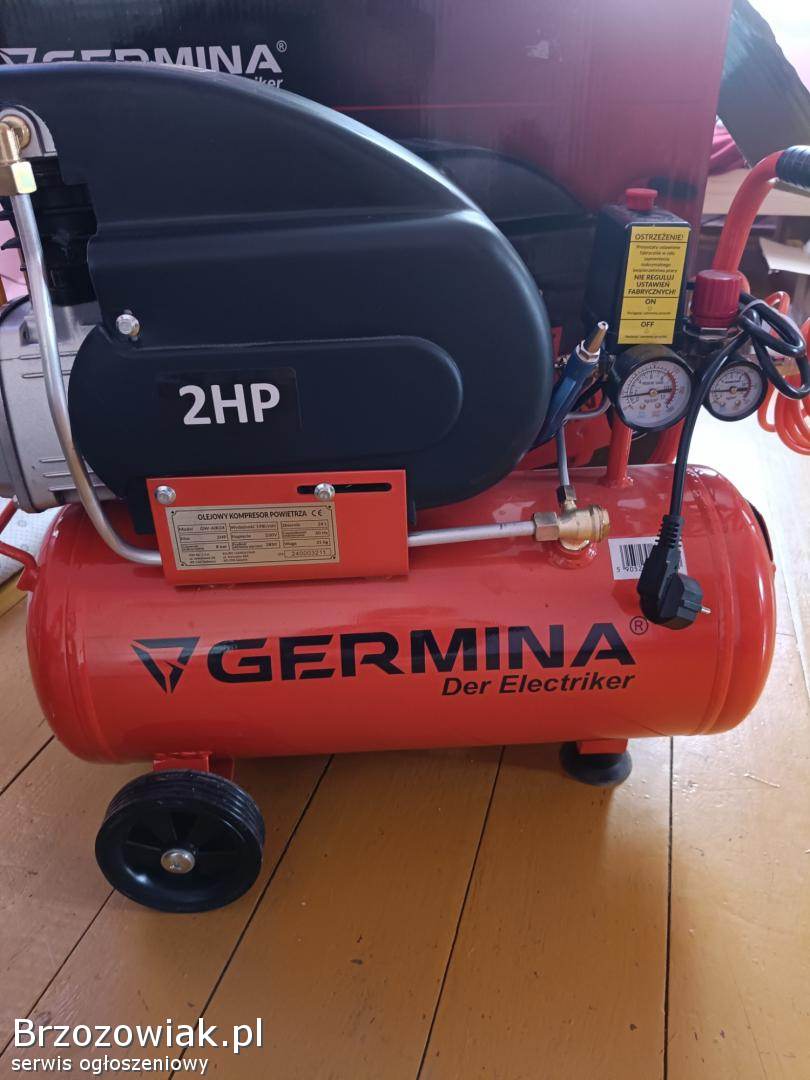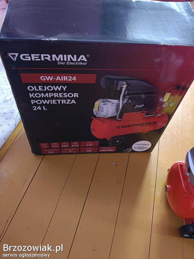 Nowy kompresor olejowy Germina 24 l z pistoletami i wężem firmy Dekster. Kompresor został rozpakowany i sprawdzony brak paragonu