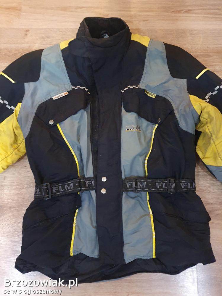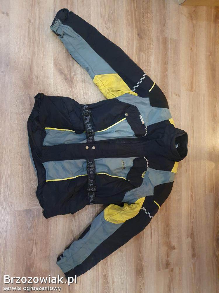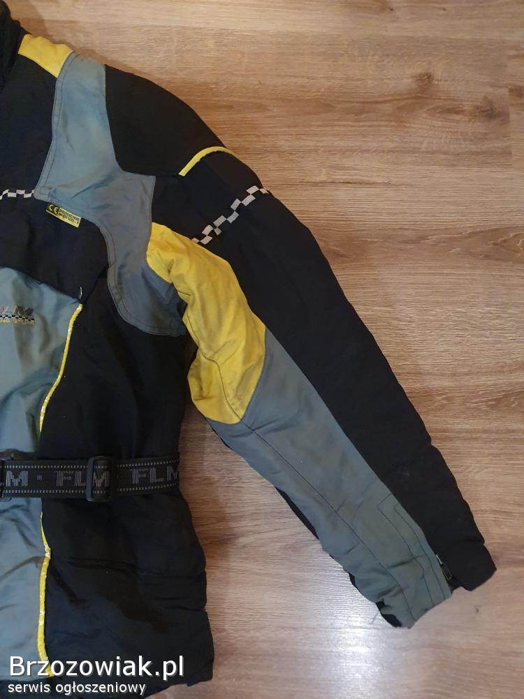 Sprzedam używaną kurtkę tekstylną FLM Polo w rozmiarze XXL. Kurtka posiada zabrudzenia na rekawie na żółtym elemencie oraz spekania na żółtych paskach.