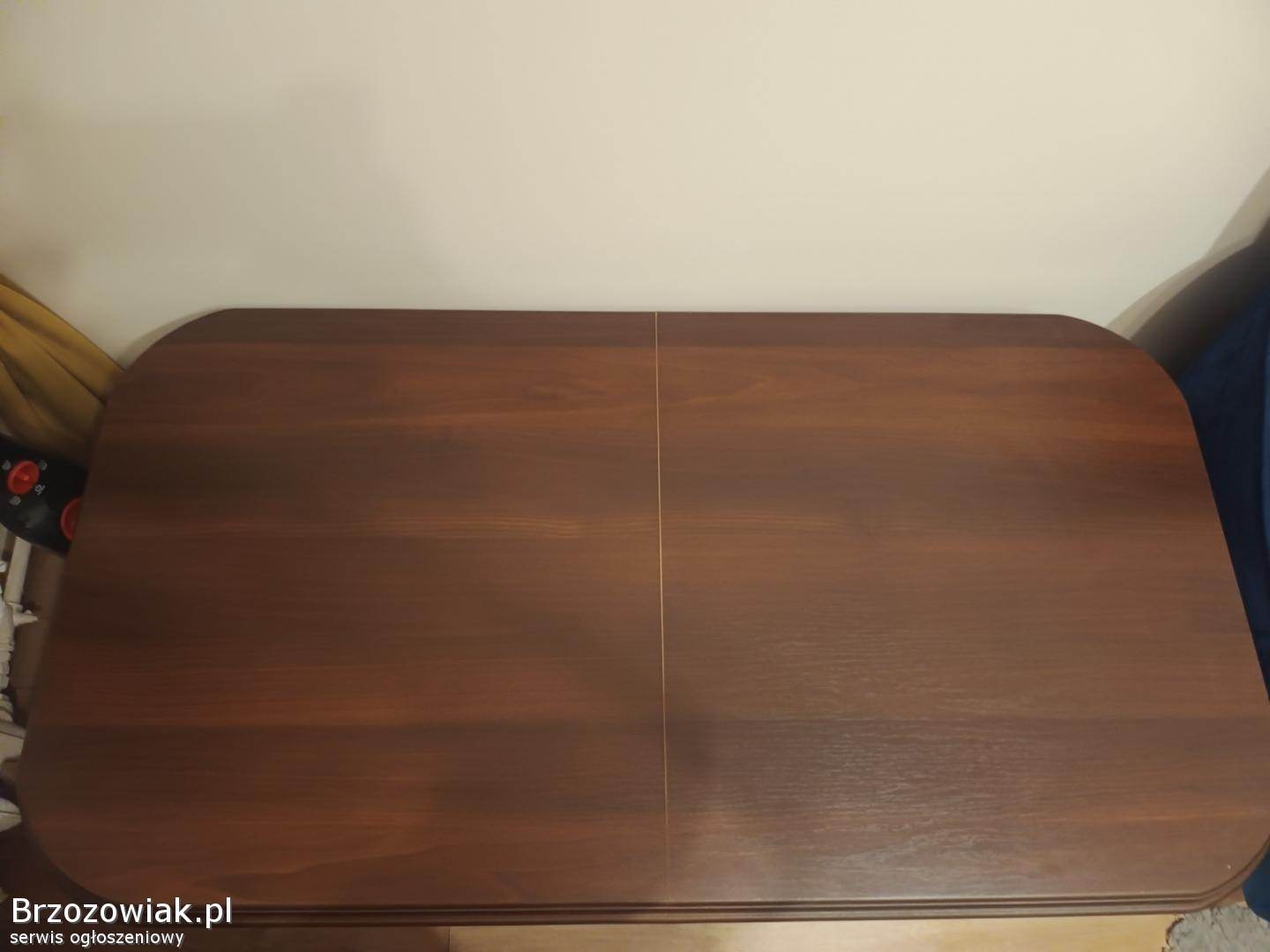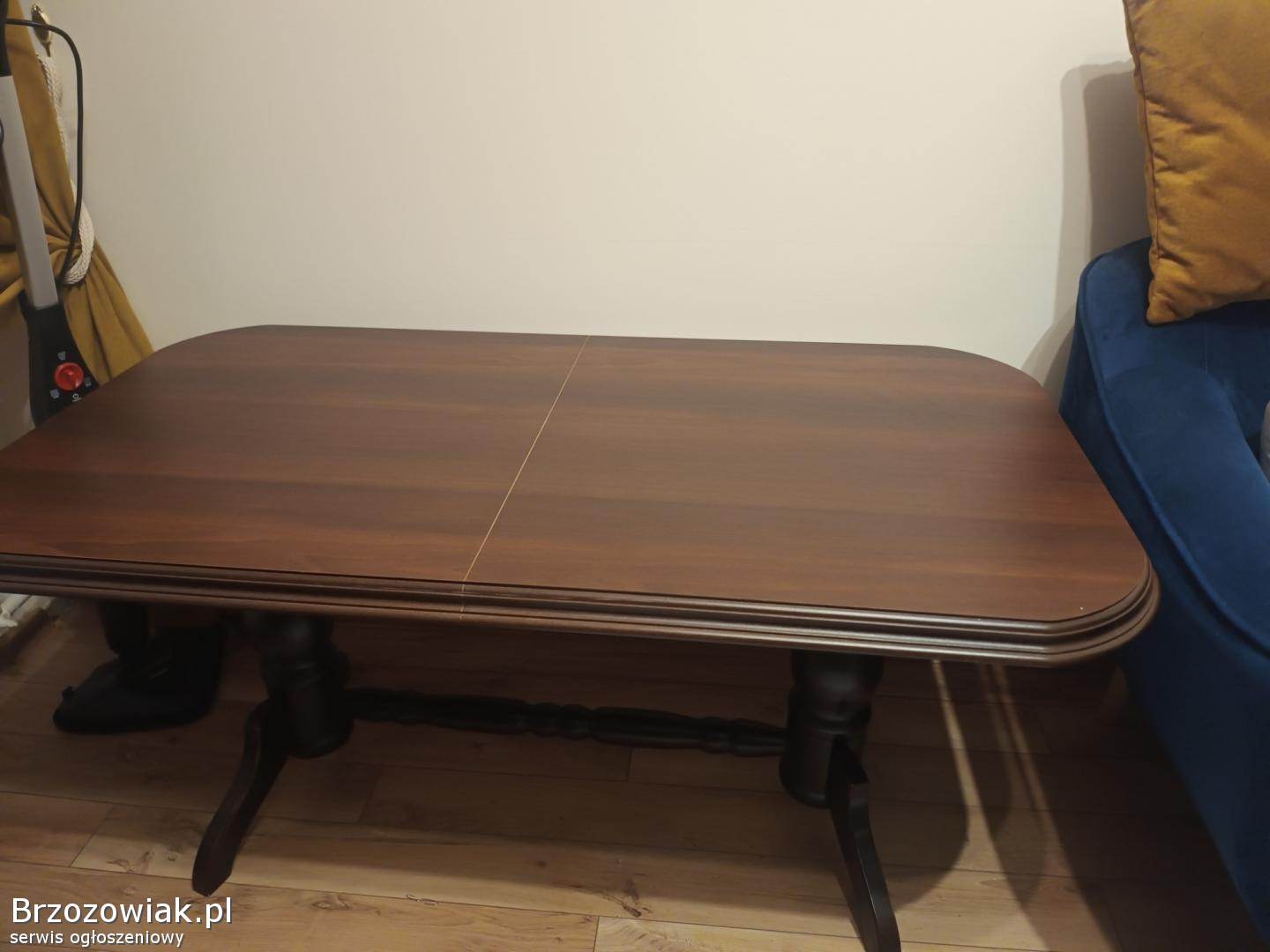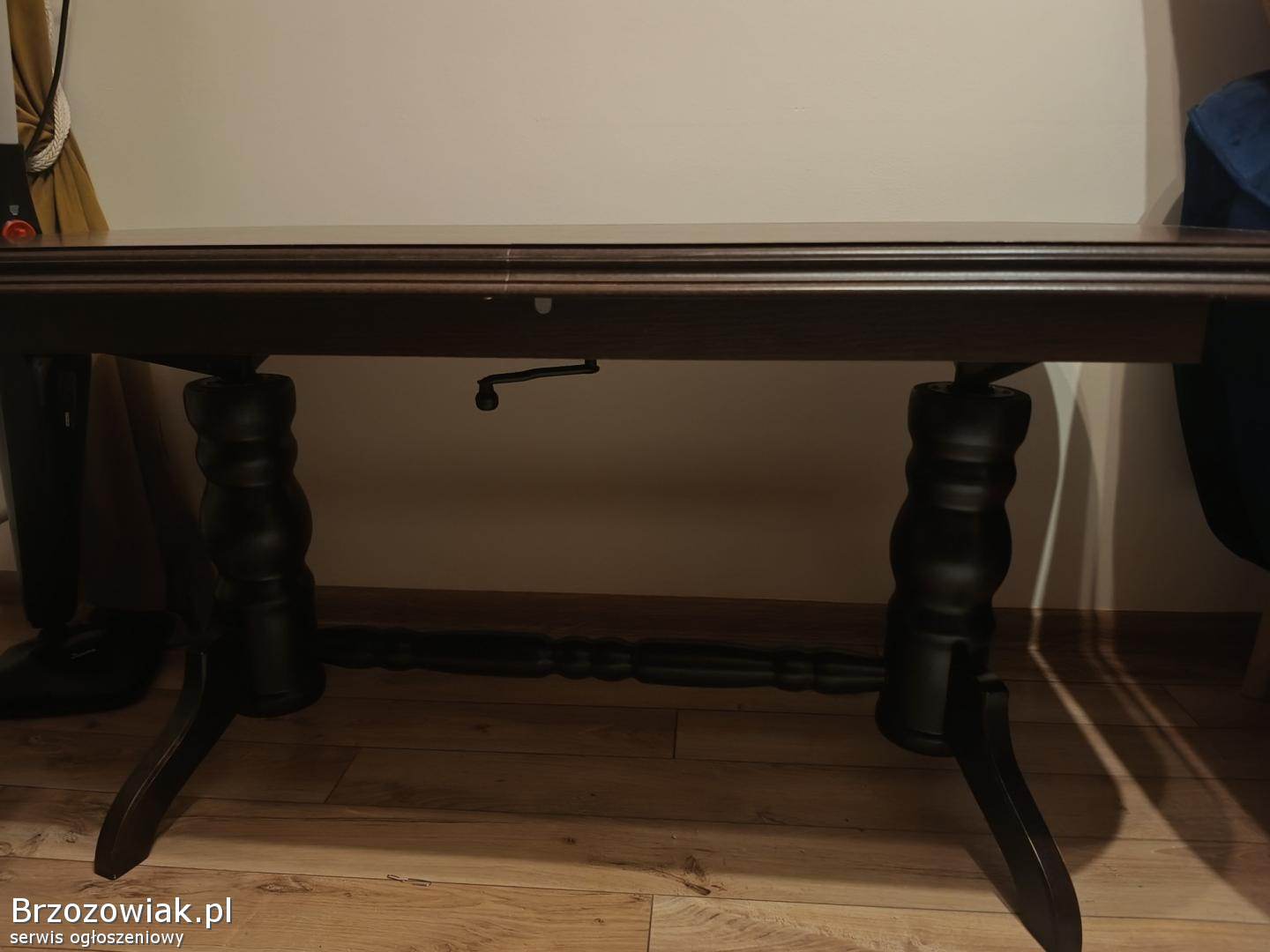 Ława drewniana kolor ciemny brązowy, stan bardzo dobry. Wymiary blatu ok 122cm X 66, wysoka na 60 cm. Jest możliwość regulacji wysokości jak i rozłożenia blatu. Odbiór w Sanoku