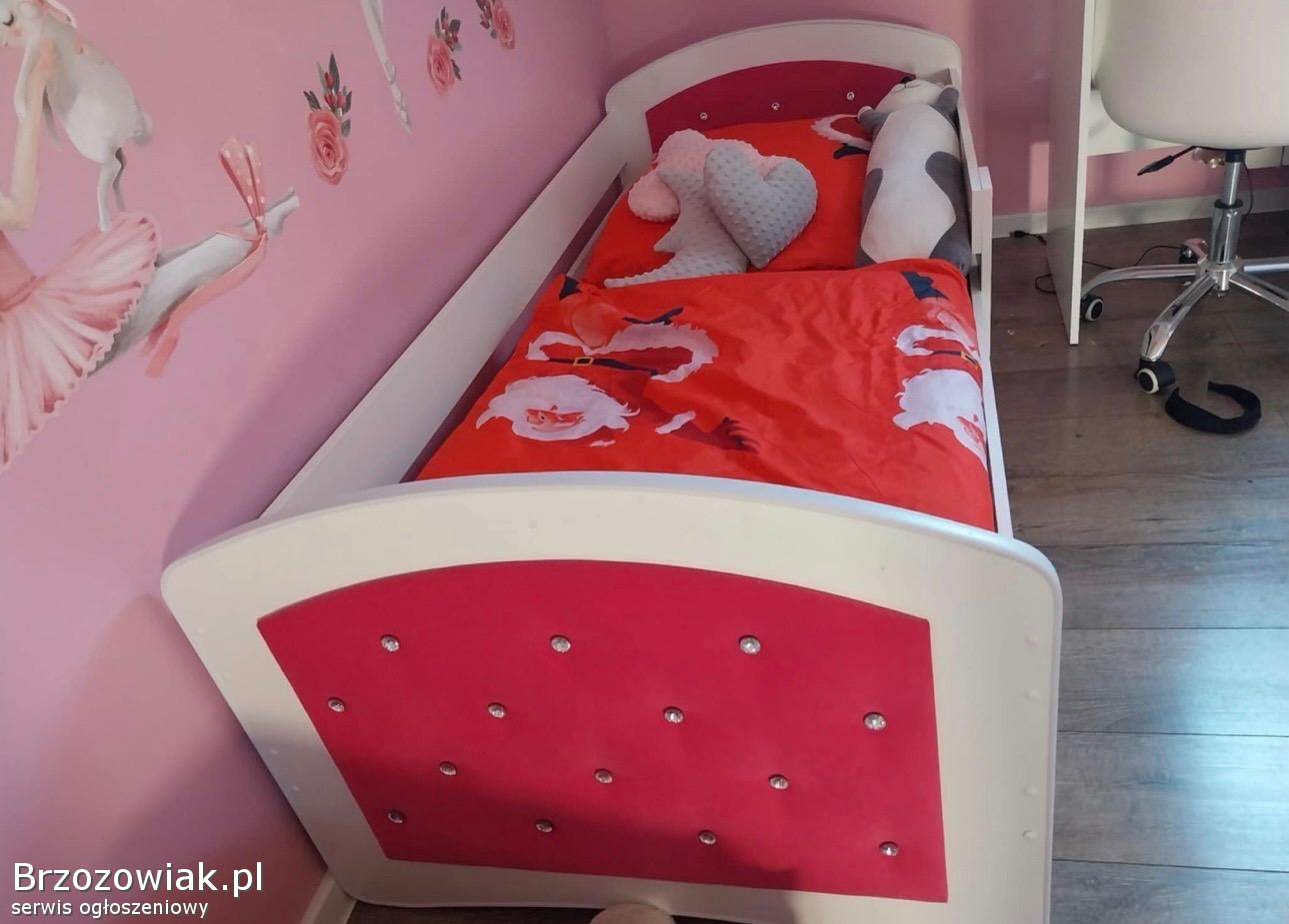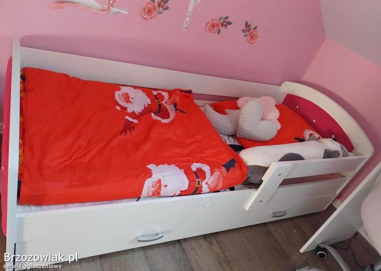 Używane jednoosobowe łóżko o wymiarach 85x185 cm. Łóżko posiada różowe obicie, dwie pojemne szuflady oraz materac piankowy. Mebel jest w stanie idealnym i gotowy do użytku.