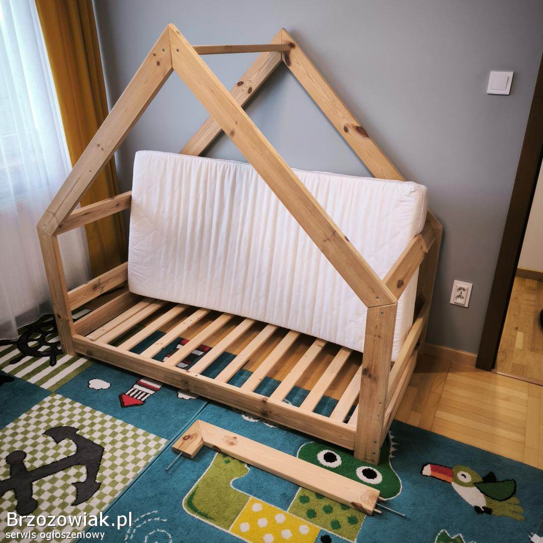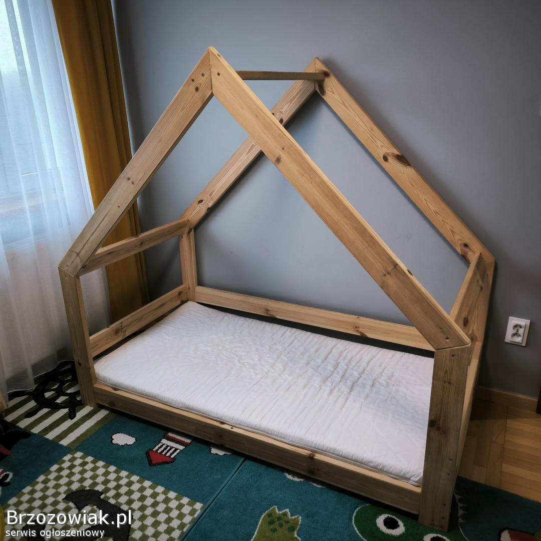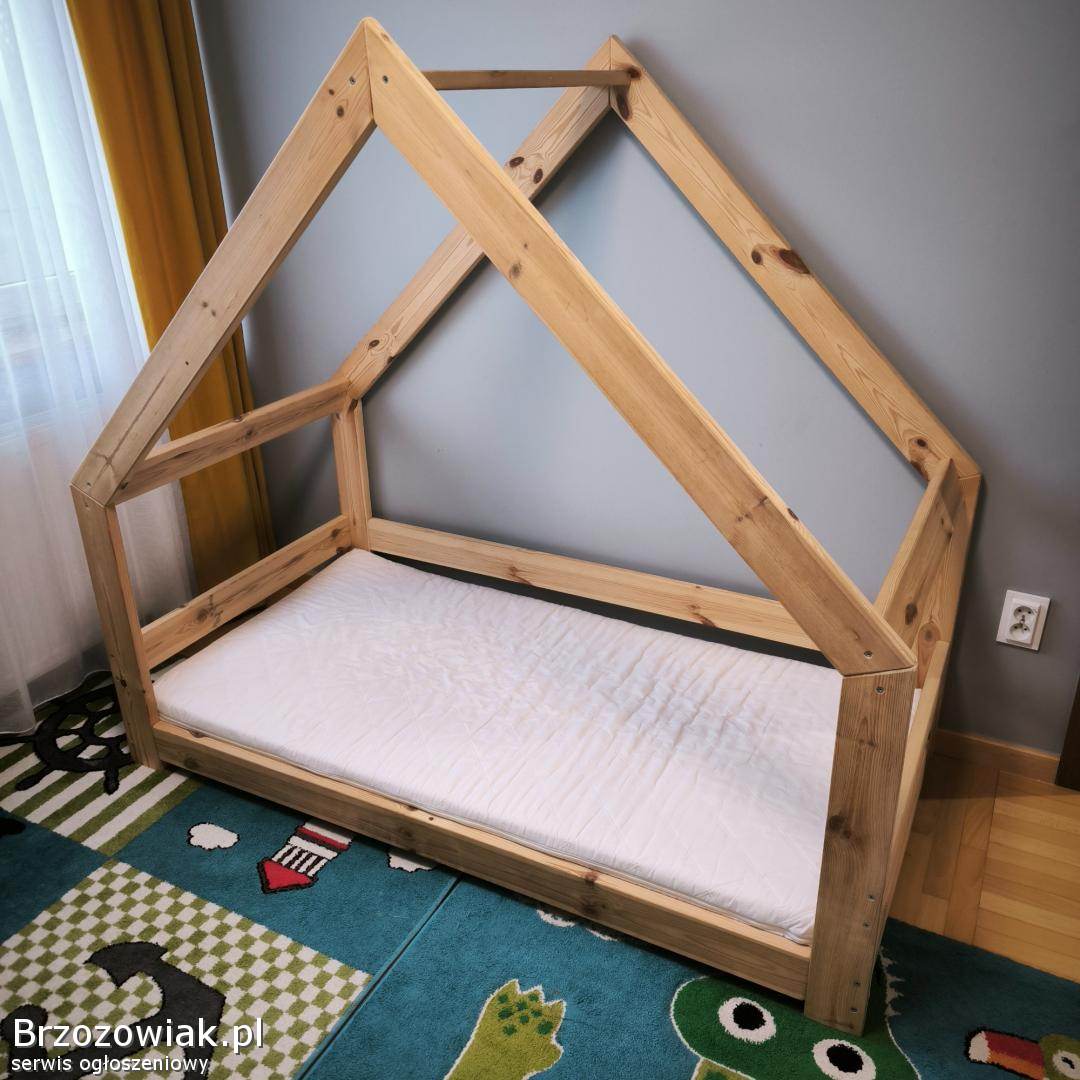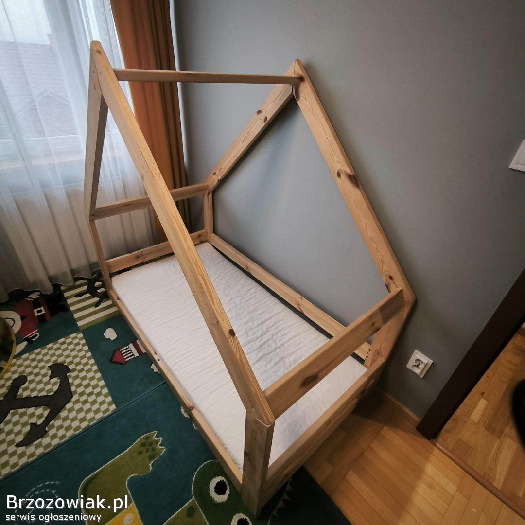 Drewniane łóżeczko domek w naturalnym kolorze o wymiarach 160x80 cm. Solidna i stabilna konstrukcja. Stan bardzo dobry. Materac w zestawie, czysty bez plam.