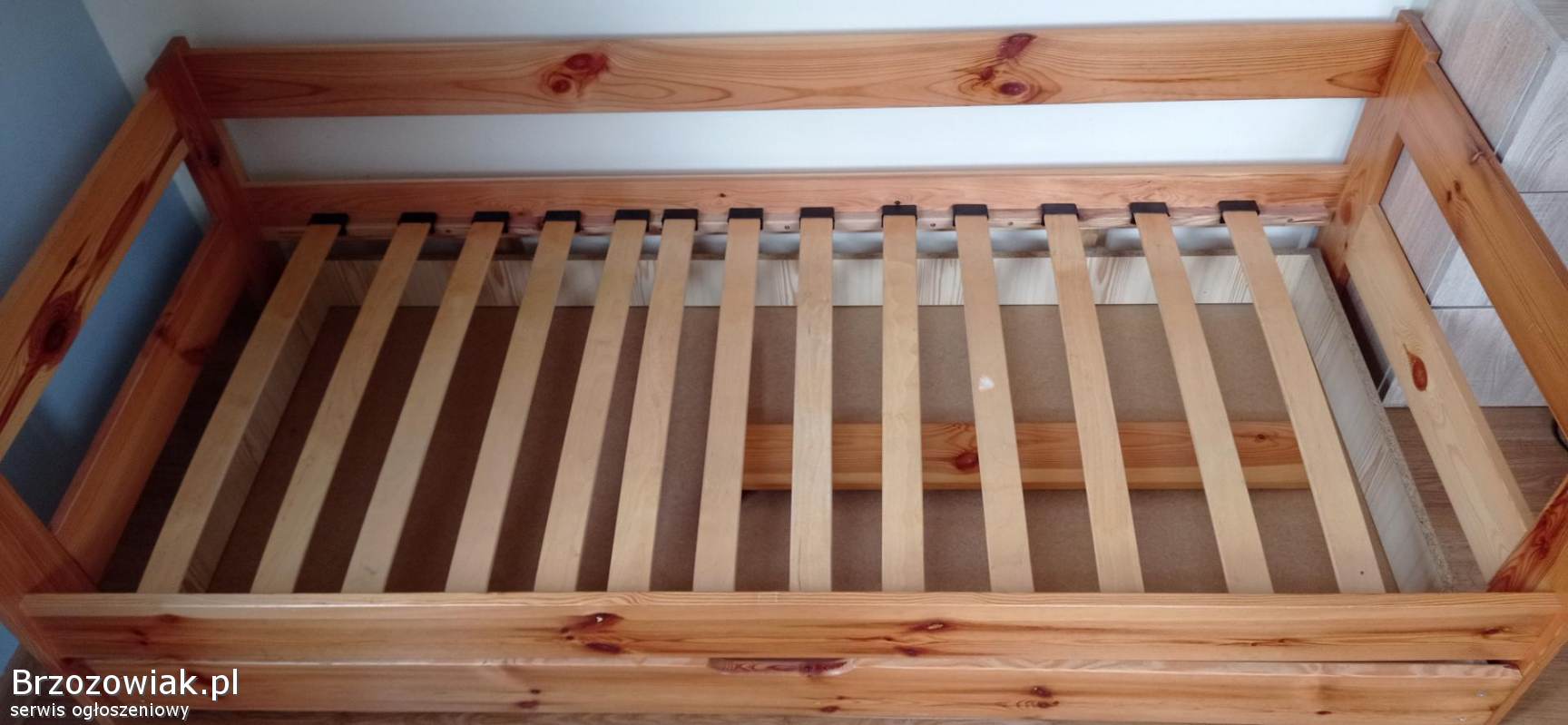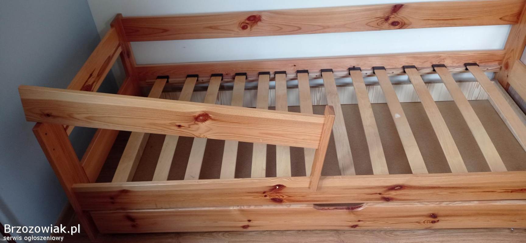 Łóżko dziecięce sosnowe z wysuwaną dużą szufladą. Łóżko ma dodatkowo montowaną barierkę do połowy łóżka (dla mniejszego dziecka). Łóżko sprzedawane bez materaca. Wymiary: długość 186 cm, szerokość 86 cm, wysokość 55 cm, wysokość szuflady 15 cm. Wymiar materaca 180x80. Transport we własnym zakresie.