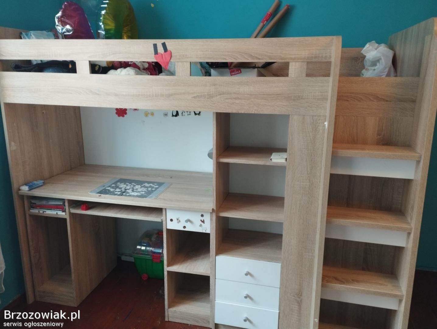 Solidne i funkcjonalne łóżko piętrowe z biurkiem i szafą, idealne do pokoju dziecięcego lub młodzieżowego. Wykonane z wysokiej jakości materiałów, zapewniające wygodę i praktyczne rozwiązania do przechowywania rzeczy. Doskonały mebel który pozwoli na optymalne wykorzystanie przestrzeni w pokoju. Nosi ślady użytkowania. Łóżko nie posiada materaca. Odbiór osobisty.