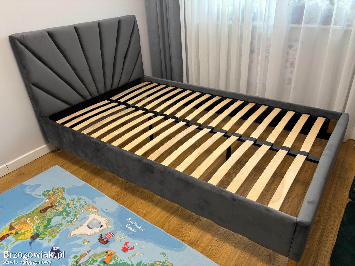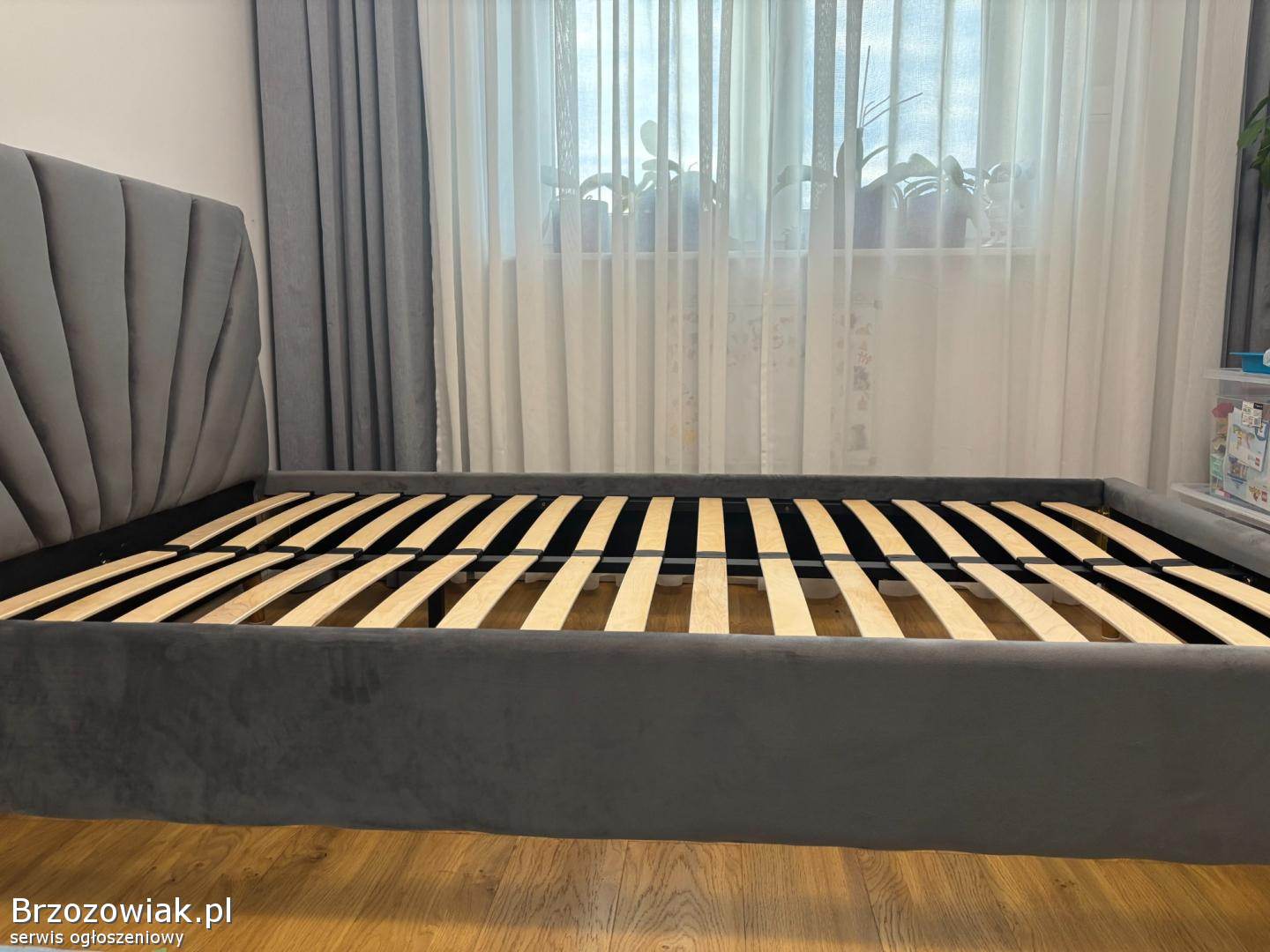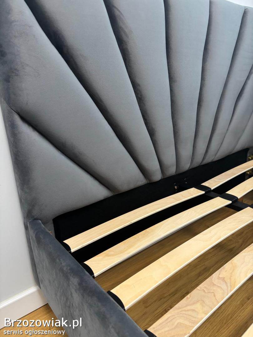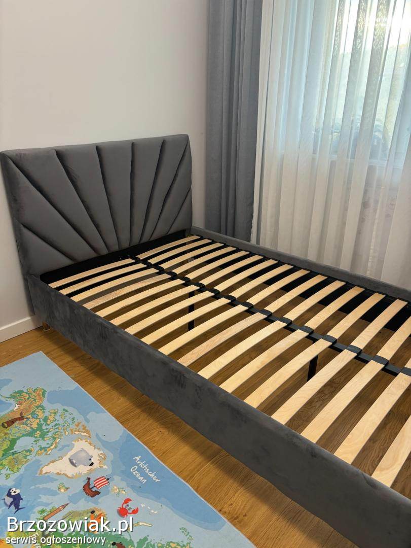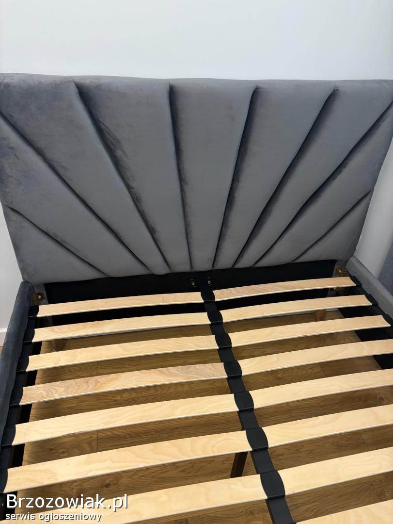 Na sprzedaż mam eleganckie łóżko w kolorze szarym z tapicerowanym, welurowym zagłówkiem o nowoczesnym, dekoracyjnym przeszyciu. Konstrukcja jest solidna, a stelaż z listew gwarantuje dobre podparcie dla materaca.