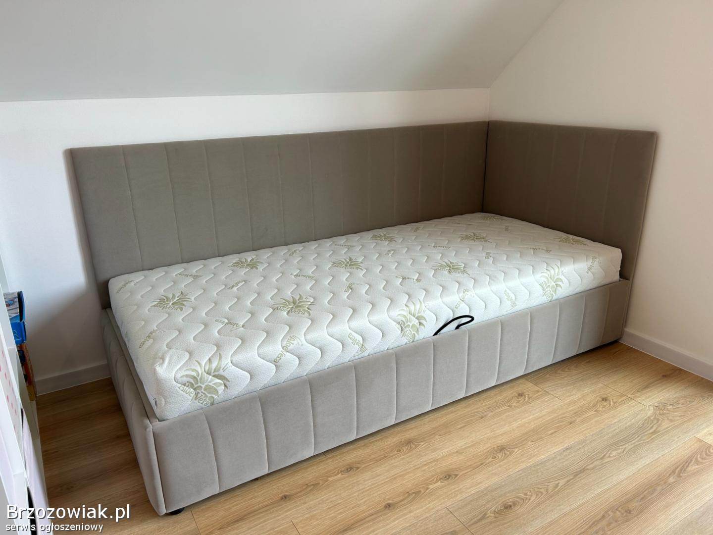 Łóżko narożne z wysokim, tapicerowanym zagłówkiem i bocznym panelem, który zapewnia komfort podczas czytania lub odpoczynku. Konstrukcja wykonana z wysokiej jakości materiałów tapicerskich gwarantuje trwałość i stabilność.