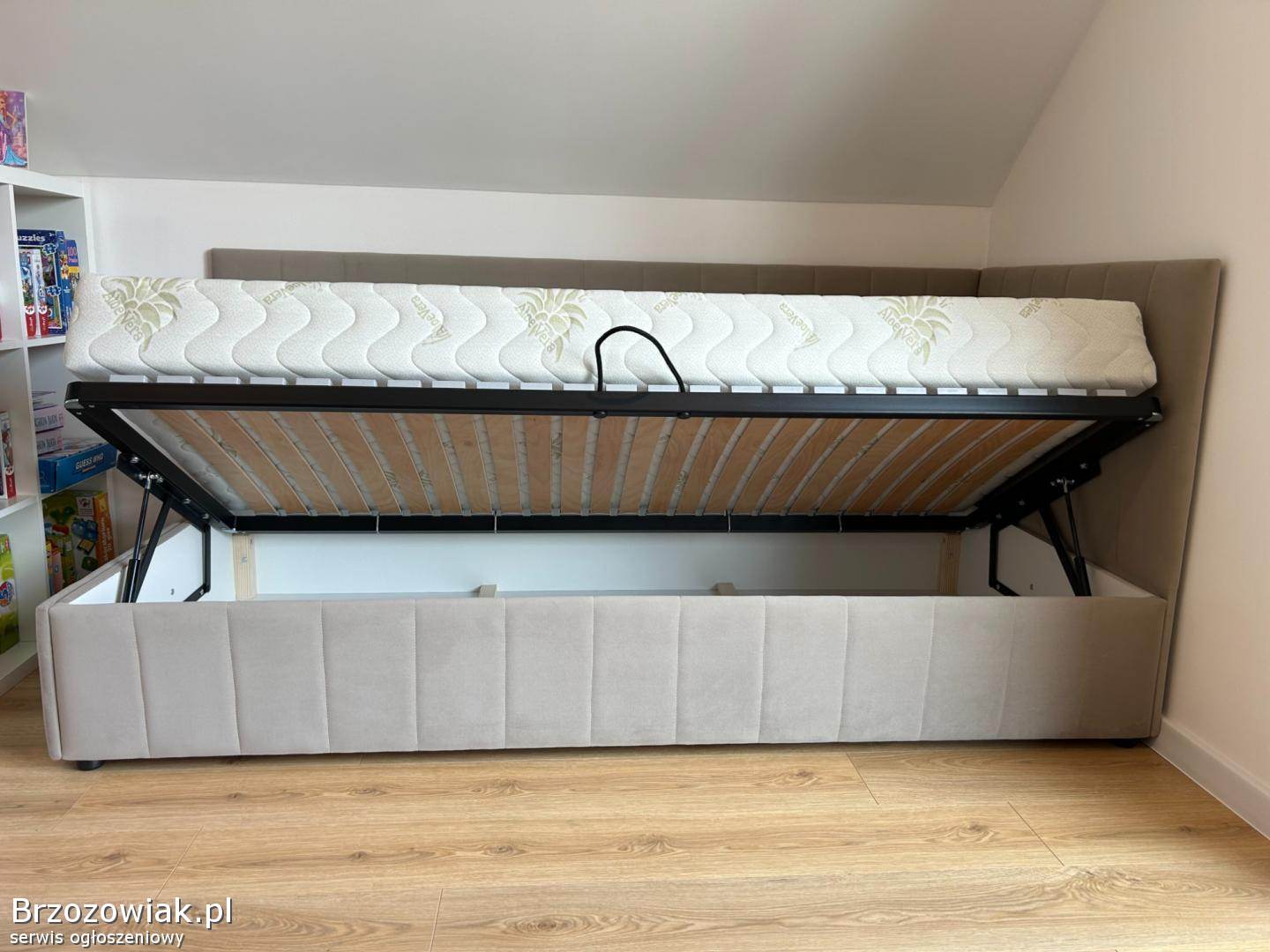 Łóżko wyposażone jest w pojemny schowek pod stelażem otwieranym na podnośnikach gazowych – idealne miejsce na przechowywanie pościeli, koców czy zabawek. Podnoszenie jest lekkie i wygodne dzięki zamontowanemu uchwytowi.