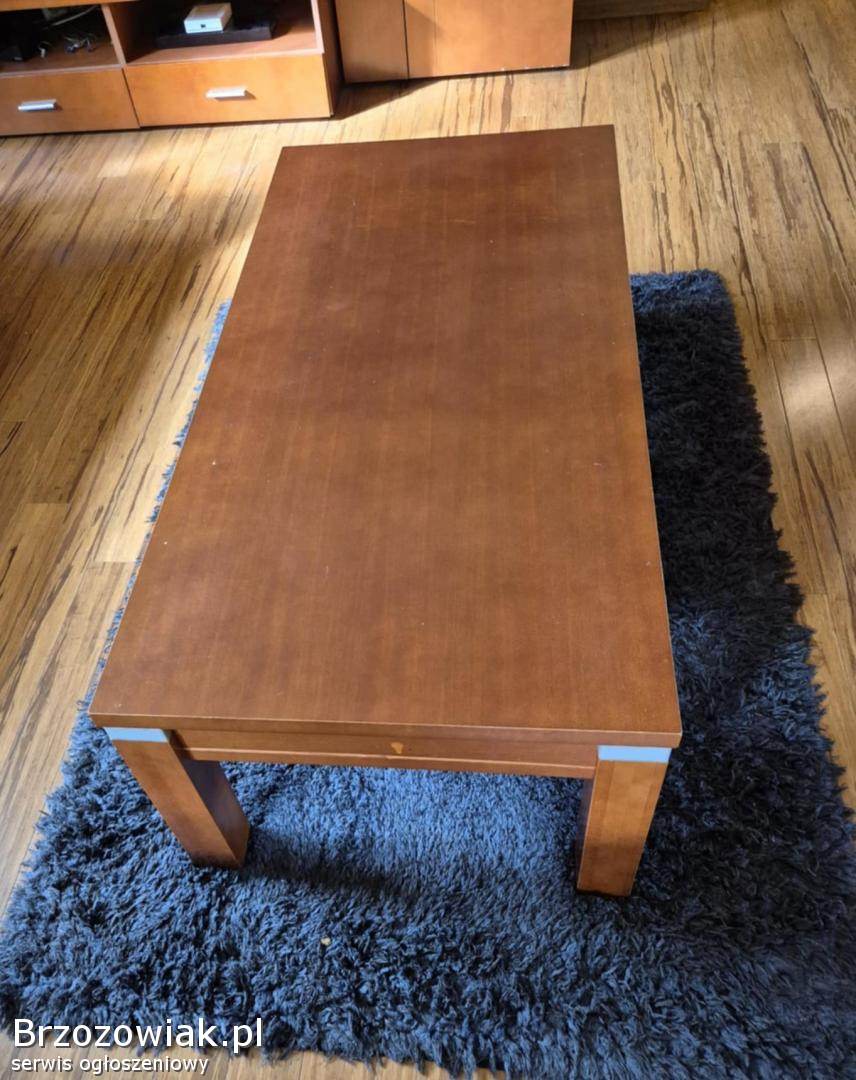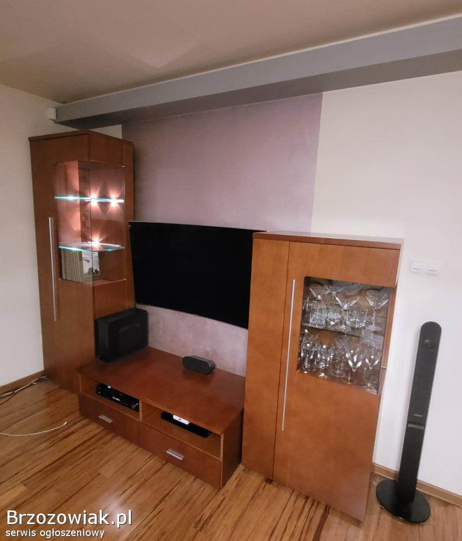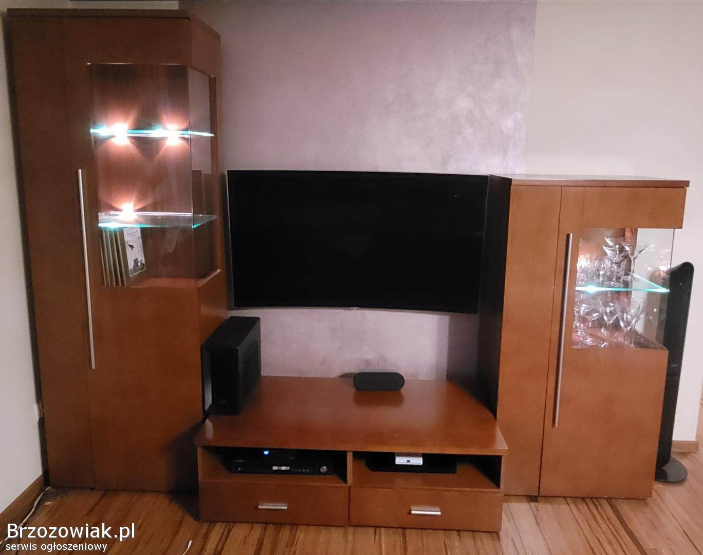 Meble Bydgoskie do salonu lub pokoju dziennego. Używane, wysoka jakość wykonania, podświetlane szklane półki. Lekkie ślady użytkowania. Składają się z 3 elementów i ławy.