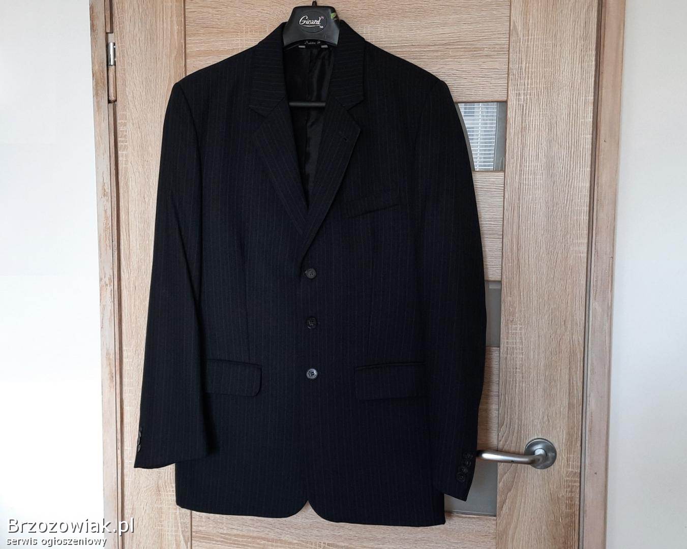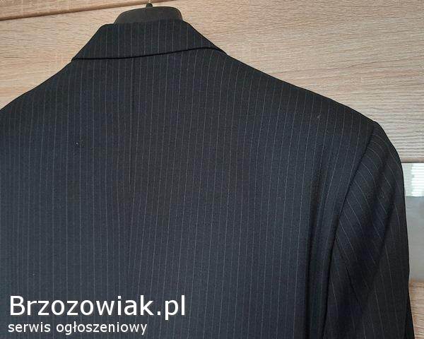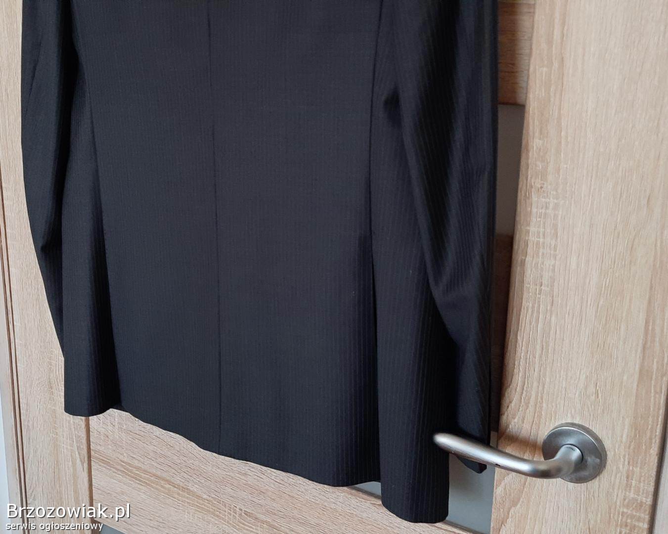 Cena 40 zł. Kolor grafitowy wpadający w czarny, wełniana, na 182 cm wzrostu (182 / 96 / 82). Marynarka: długość rękawa ok. 69 cm, zapinana na 3 guziki, w klapie butonierka, kieszonka na poszetkę, dwie kieszenie zewnętrzne z patkami, wewnątrz 4 kieszenie. Całość na doskonałej jakości podszewce. Zakupiona w salonie, uszyta bardzo starannie w każdym szczególe. Bardzo wygodna, całoroczna, pasuje do różnych stylizacji, zawsze prezentuje się bardzo pięknie. Zapraszam, tel. 507-694-505.