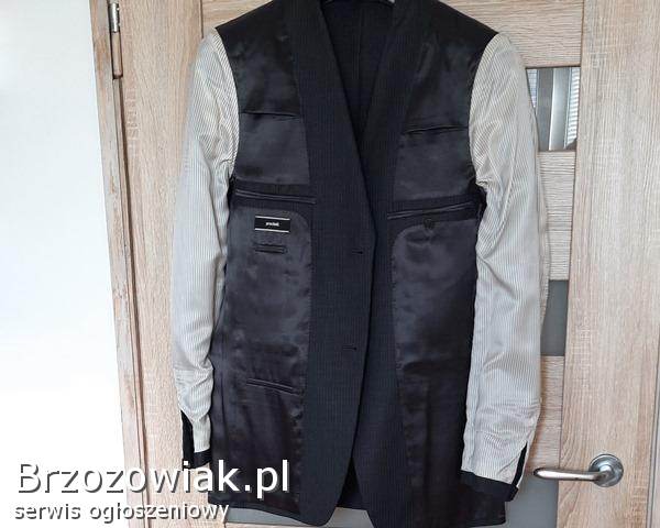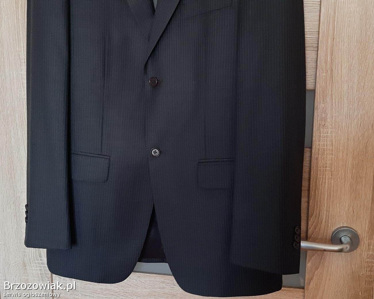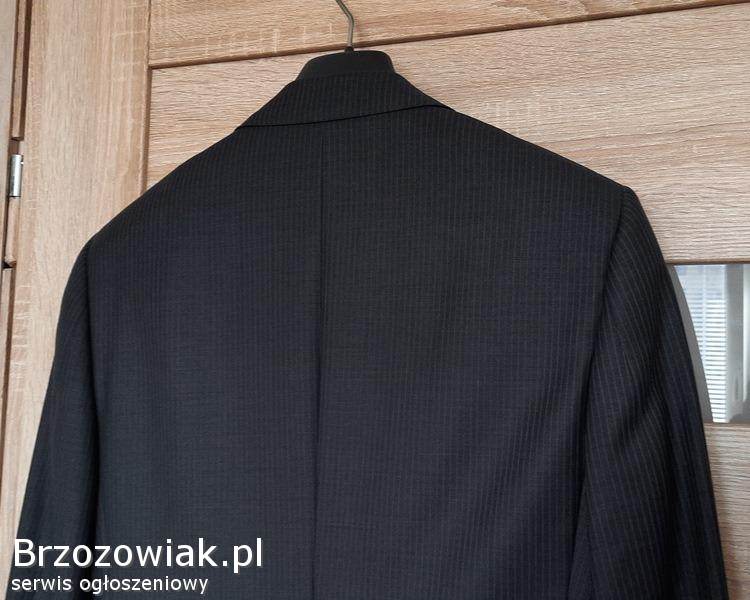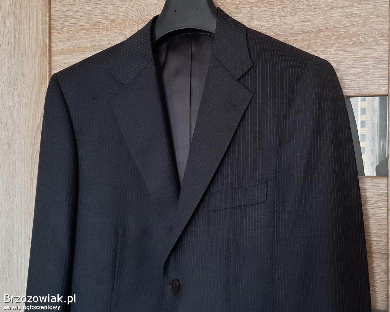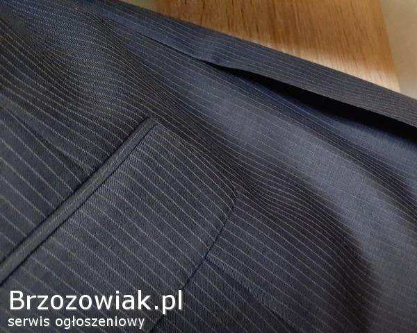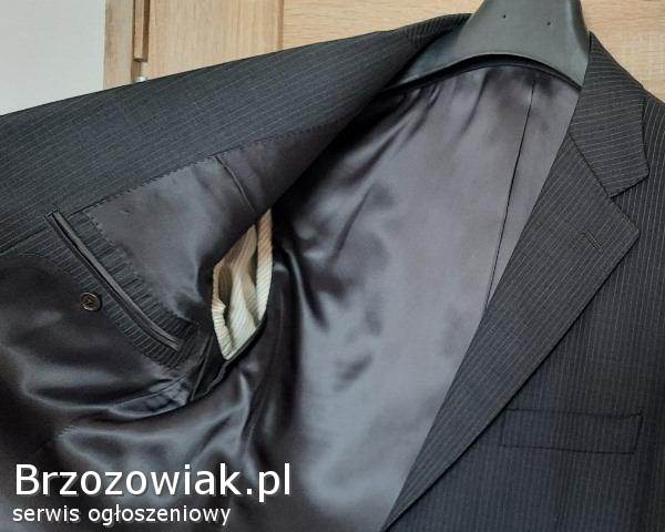 Cena 40 zł. Materiał: 95 wełna i 5 poliester; na 182 cm wzrostu (182 / 96 / 82), długość rękawa ok. 69 cm, zapinana na 2 guziki, w klapie butonierka; z przodu posiada jeszcze fabrycznie zszyte: kieszonkę na poszetkę oraz dwie kieszenie zewnętrzne z patkami; wewnątrz 4 kieszenie, z tyłu marynarki dwa rozcięcia (również zafastrygowane fabrycznie), całość na doskonałej jakości podszewce. Zakupiona w sklepie firmowym, wykonana z niezwykłą starannością, bardzo elegancka, pasuje do różnych stylizacji, całoroczna.
