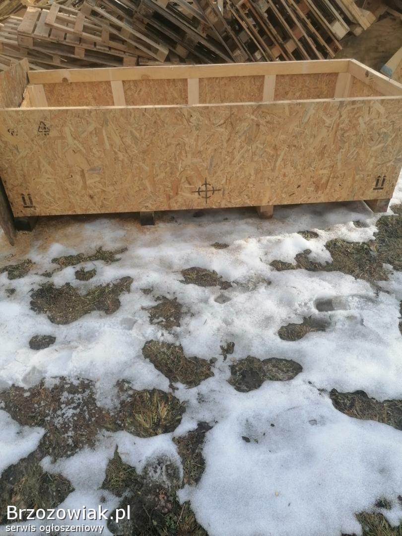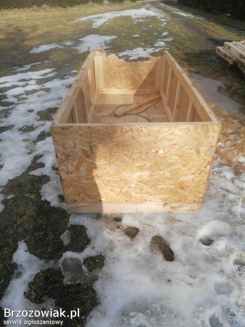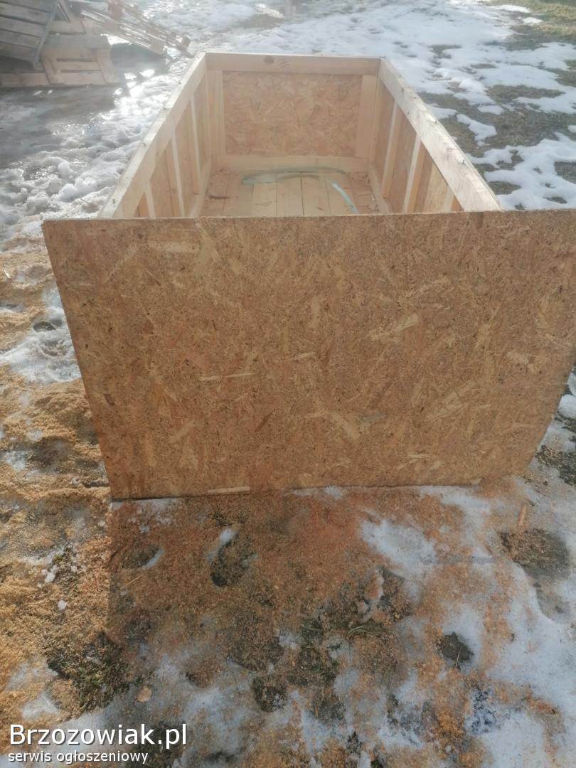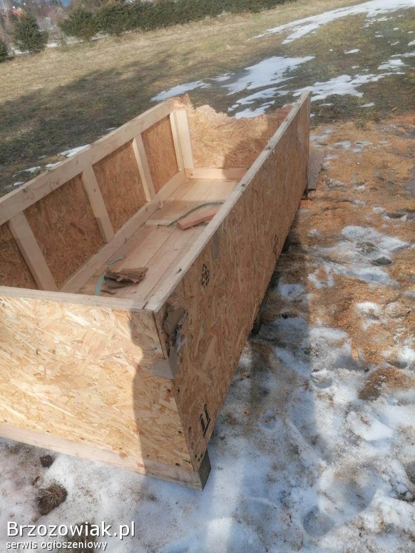 Sprzedam bardzo mocną skrzynie na drewno węgiel trociny pelet itp. Wymiary 230cm długość 99cm szerokość 60cm wysokość. Skrzynia posiada paletę od spodu. Jest uszkodzony jeden bok dorzucam płytę na wymianę.