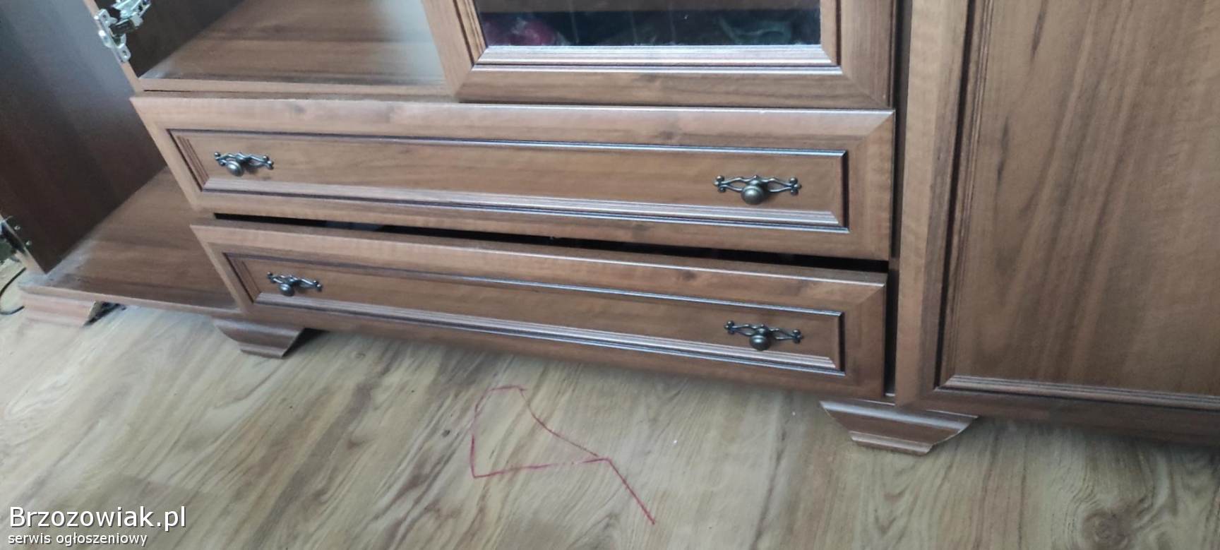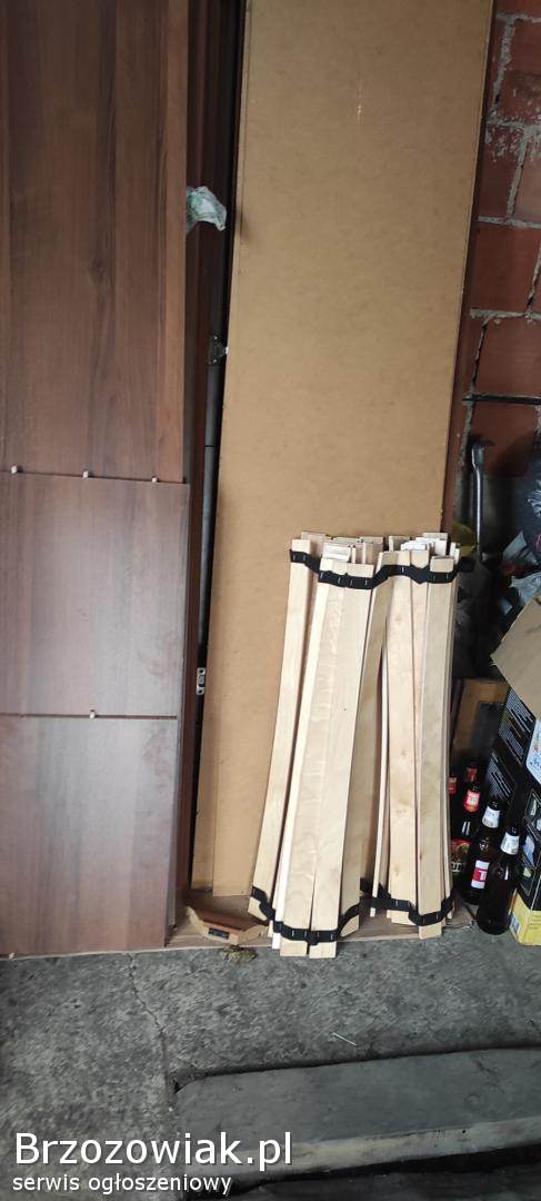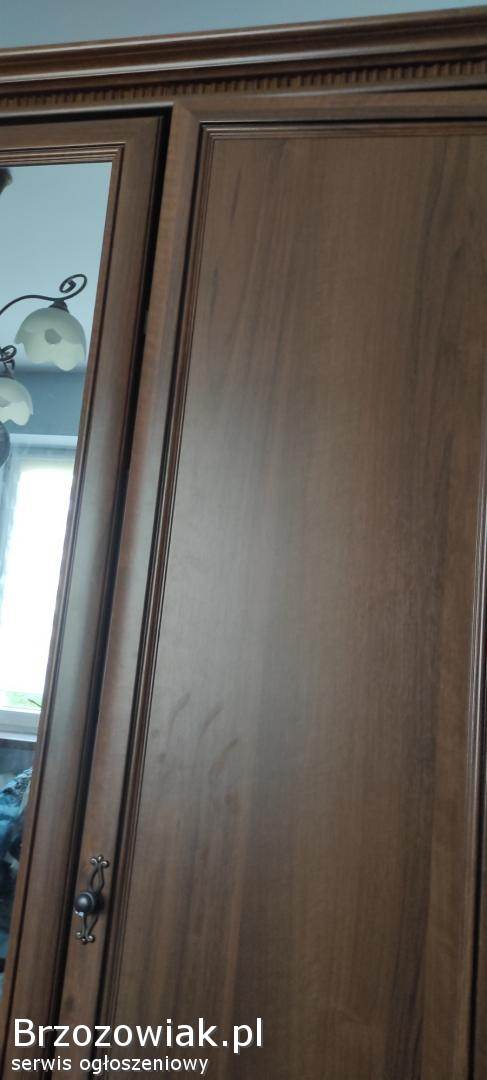 Meble w dobrym stanie, nie porysowane, łóżko, stelaż, szafa z dwiema szufladami, lustro na drzwiach, szafki nocne. Kompletne.