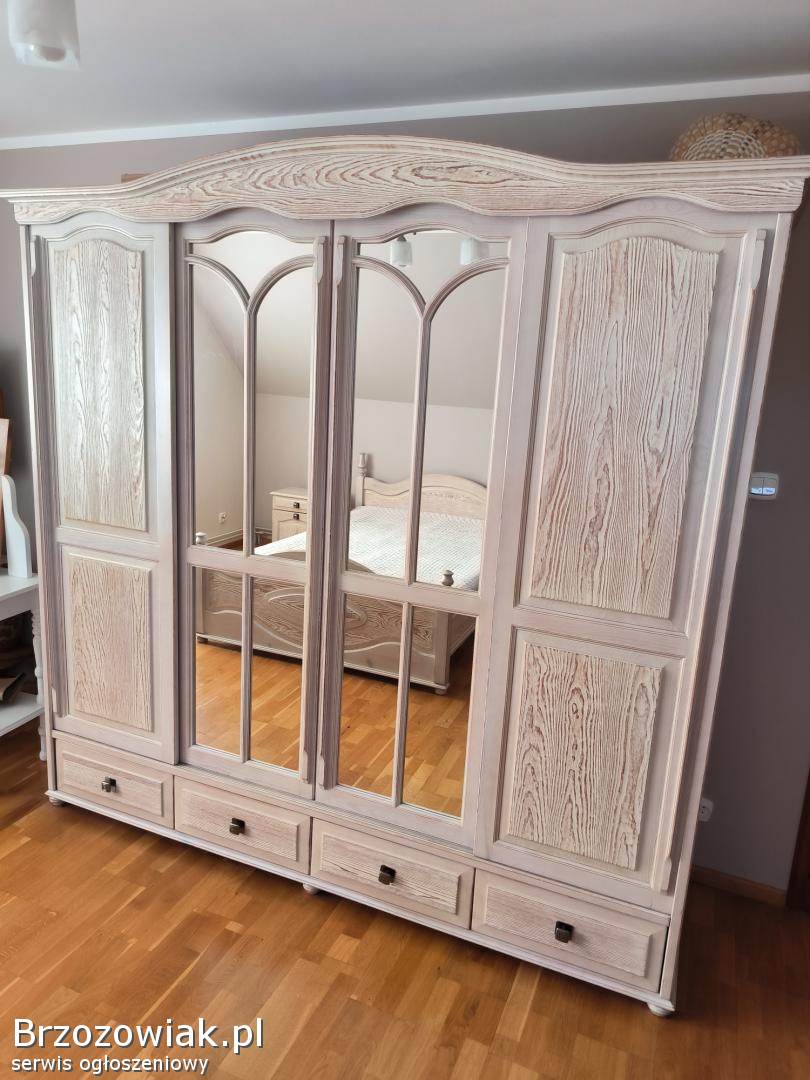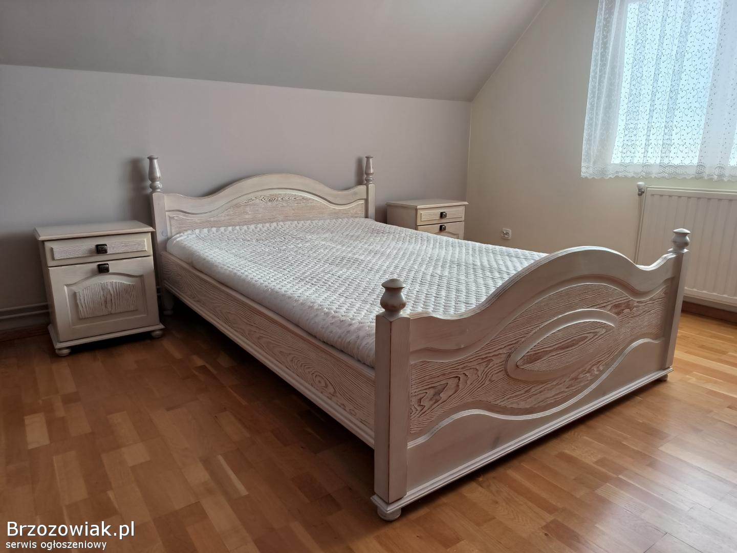 Sprzedam komplet używanych mebli do sypialni. Wykonane z litego drewna sosnowego, szczotkowane i zabielone. Stan bardzo dobry. W skład kompletu wchodzi łóżko pod materac o wymiarach 200x140, 2 szafki nocne oraz szafa z drzwiami przesuwnymi