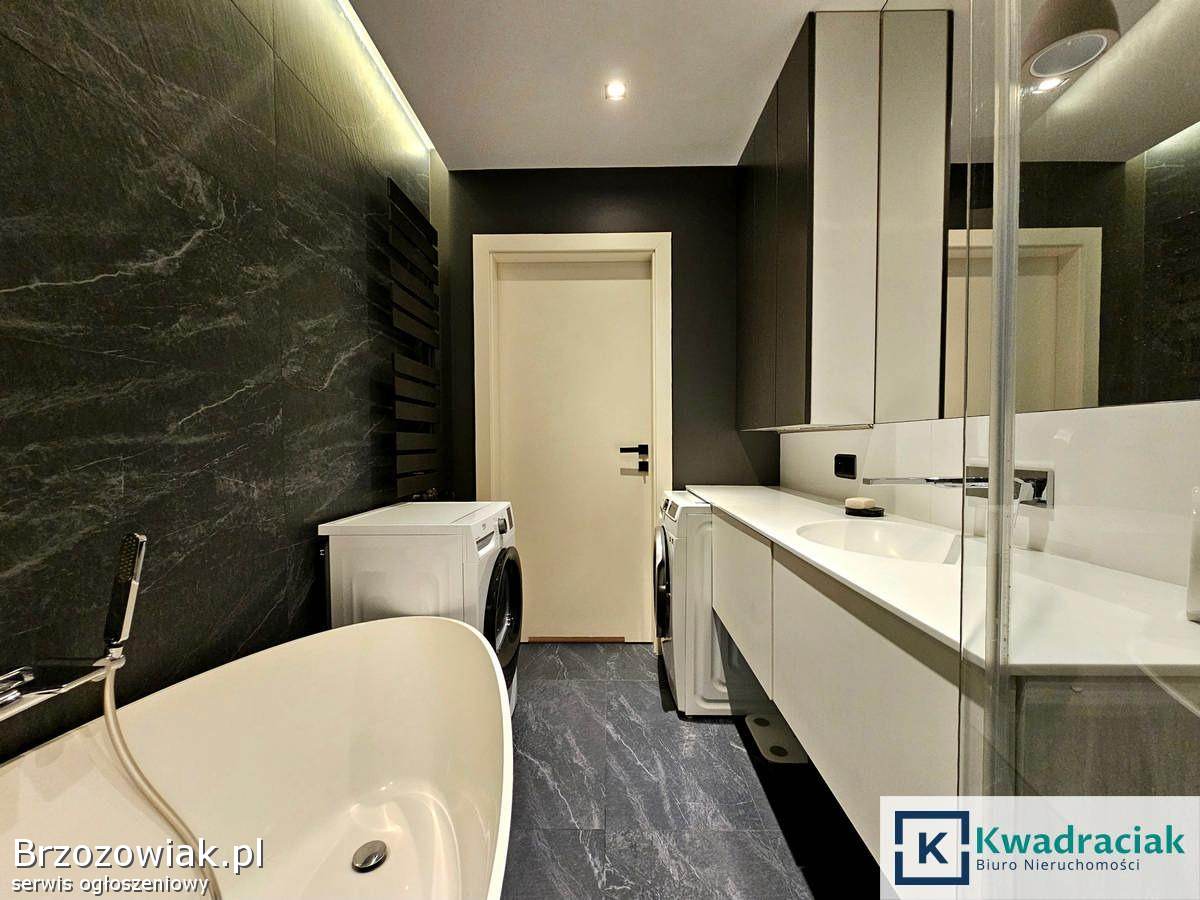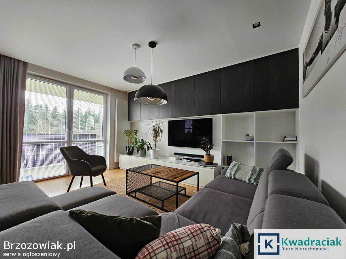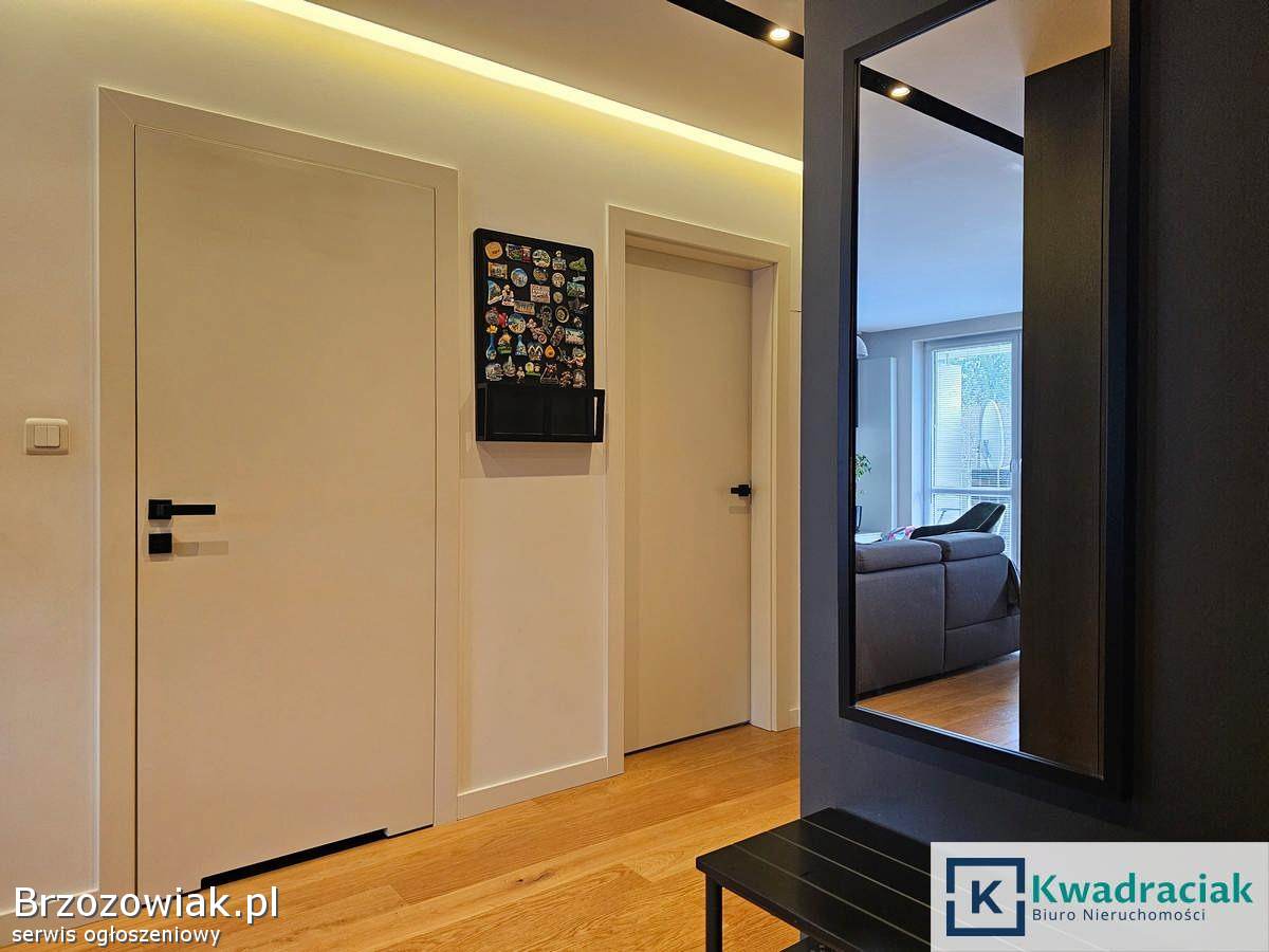 Mieszkanie o powierzchni użytkowej 67, 47 m² znajduje się na parterze. Składa się z przestronnego salonu połączonego z kuchnią, z którego prowadzi wyjście na balkon o powierzchni 6, 28 m², dwóch komfortowych sypialni, łazienki z ogrzewaniem podłogowym, oddzielnego WC również z podłogówką oraz korytarza z zabudową. Dodatkowym atutem jest duży, aż 63-metrowy taras, komórka lokatorska o powierzchni 4, 26 m² oraz miejsce postojowe w garażu podziemnym. Mieszkanie jest wykończone w wysokim standardzie – umeblowane meblami wykonanymi na wymiar, wyposażone w kuchnię z marmurowym blatem, a na podłogach znajdują się drewniane panele Baltic Wood. Lokal jest klimatyzowany. Bardzo dobry stan oraz wysoka jakość wykończenia sprawia, że mieszkanie jest gotowe do wprowadzenia bez dodatkowych nakładów.