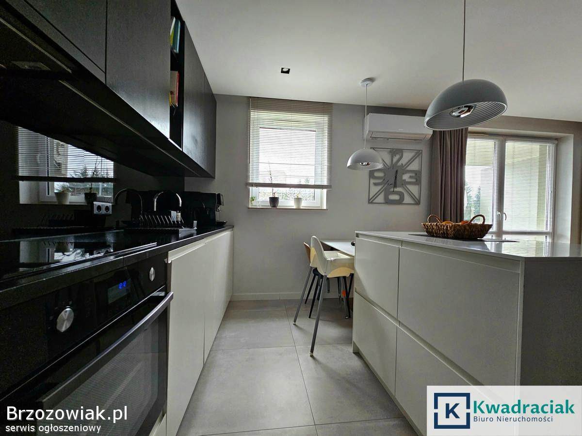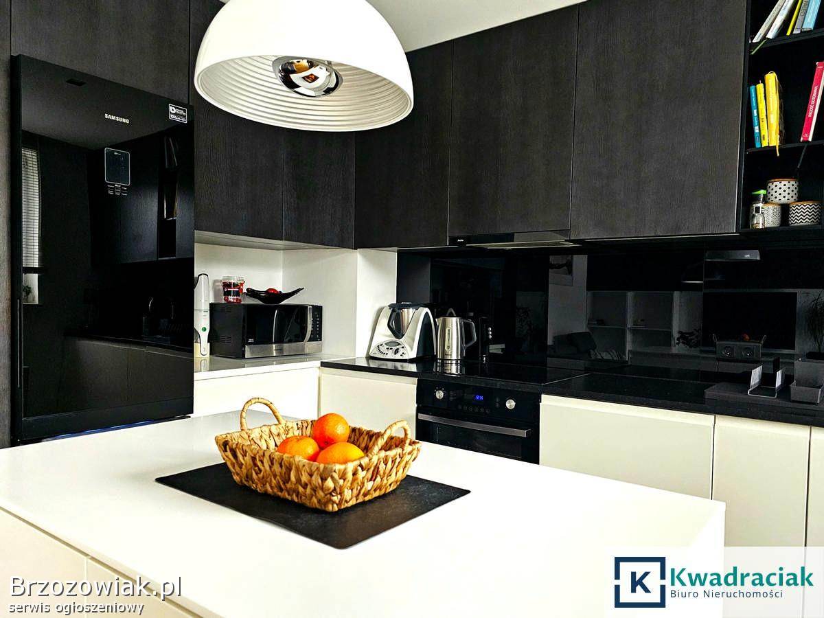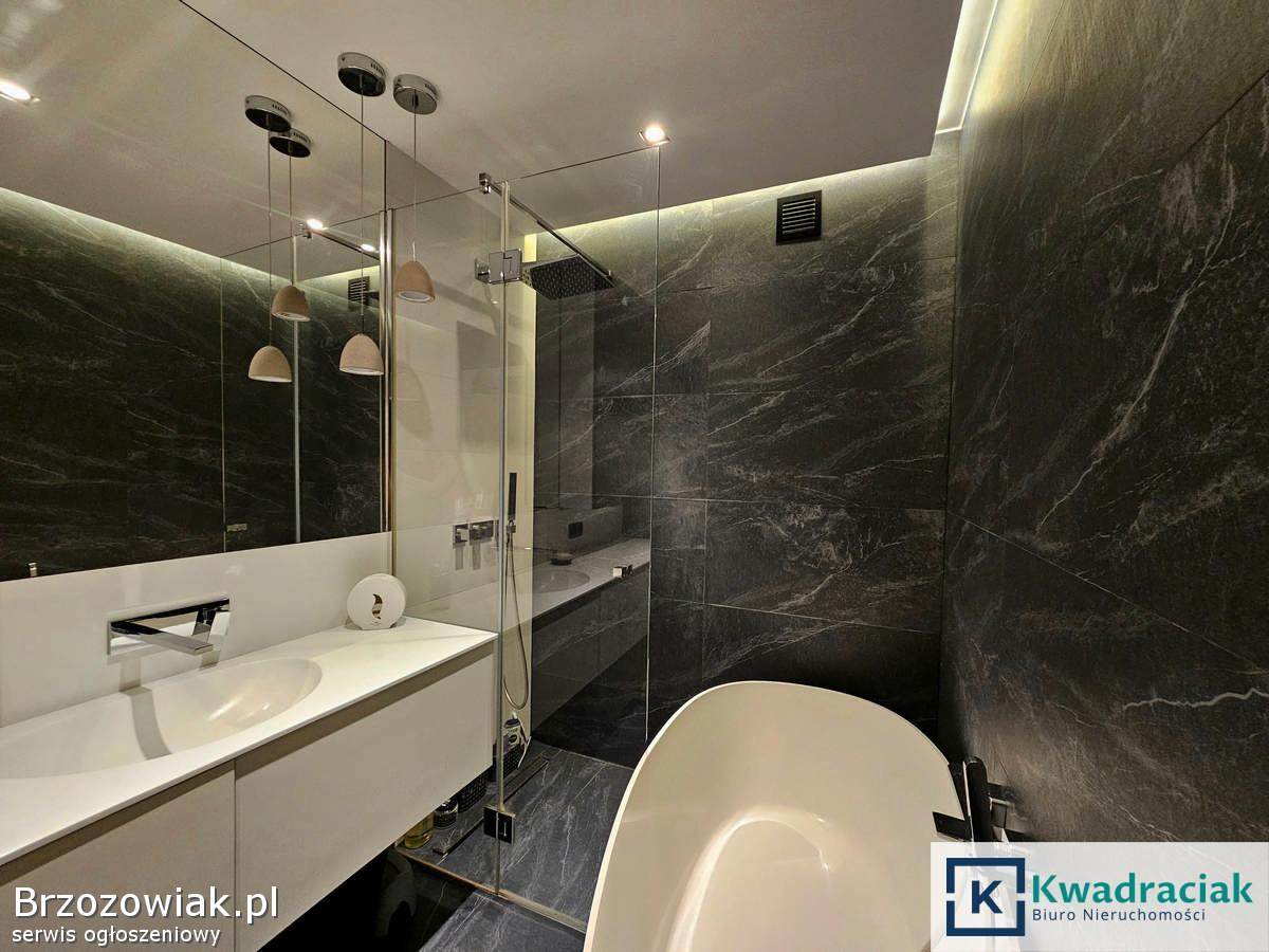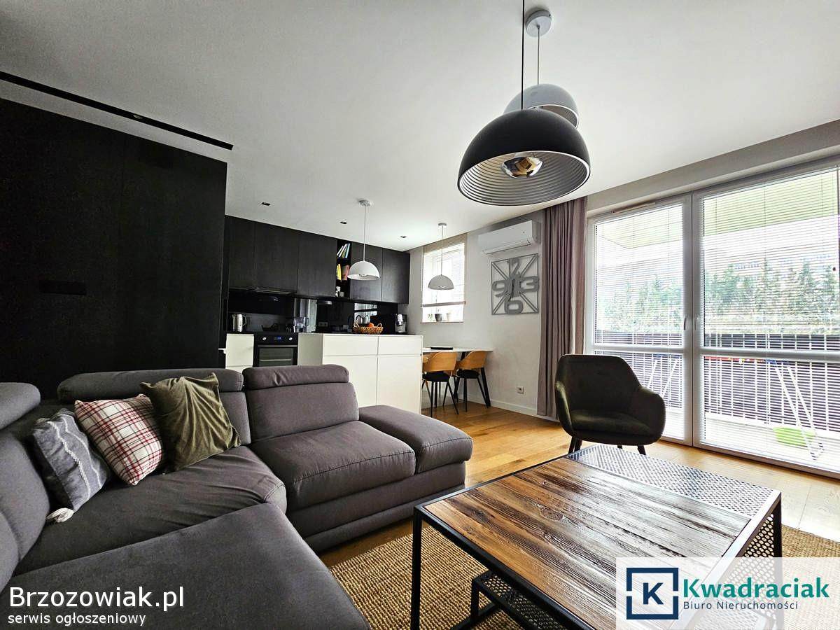 Mieszkanie o powierzchni użytkowej 67, 47 m² znajduje się na parterze. Składa się z przestronnego salonu połączonego z kuchnią, z którego prowadzi wyjście na balkon o powierzchni 6, 28 m², dwóch komfortowych sypialni, łazienki z ogrzewaniem podłogowym, oddzielnego WC również z podłogówką oraz korytarza z zabudową. Dodatkowym atutem jest duży, aż 63-metrowy taras, komórka lokatorska o powierzchni 4, 26 m² oraz miejsce postojowe w garażu podziemnym. Mieszkanie jest wykończone w wysokim standardzie – umeblowane meblami wykonanymi na wymiar, wyposażone w kuchnię z marmurowym blatem, a na podłogach znajdują się drewniane panele Baltic Wood. Lokal jest klimatyzowany. Bardzo dobry stan oraz wysoka jakość wykończenia sprawia, że mieszkanie jest gotowe do wprowadzenia bez dodatkowych nakładów.