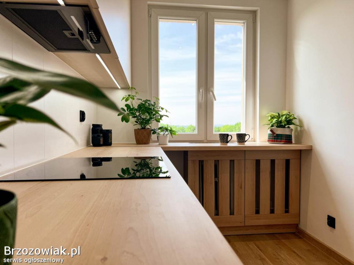Kuchnia została zaprojektowana z myślą o funkcjonalności i estetyce – znajduje się w niej nowoczesna zabudowa meblowa wraz z kompletem nowego sprzętu AGD, co stanowi idealne rozwiązanie dla osób ceniących wygodę i styl.