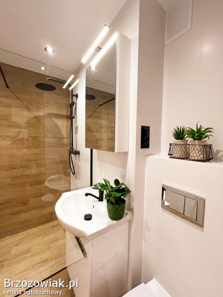Łazienka została wykończona w wysokim standardzie – znajduje się w niej nowoczesna kabina prysznicowa typu walk-in oraz praktyczne rozwiązania zapewniające komfort codziennego użytkowania.